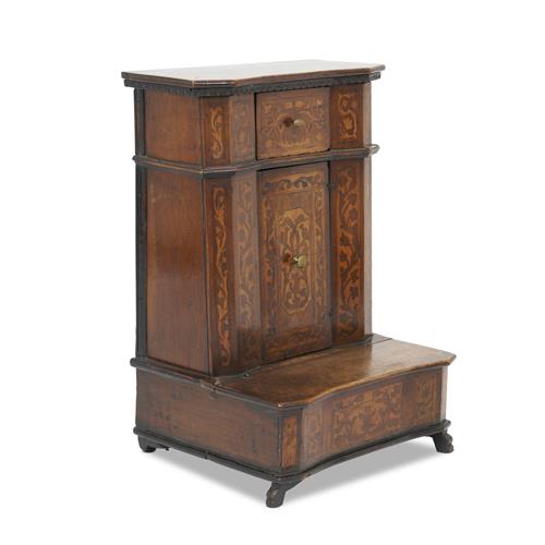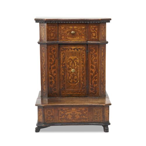 Of shaped rectangular outline, the upper part with a drawer above a cupboard, the hinged top of the base enclosing a further compartment, the front inlaid with floral and foliate designs