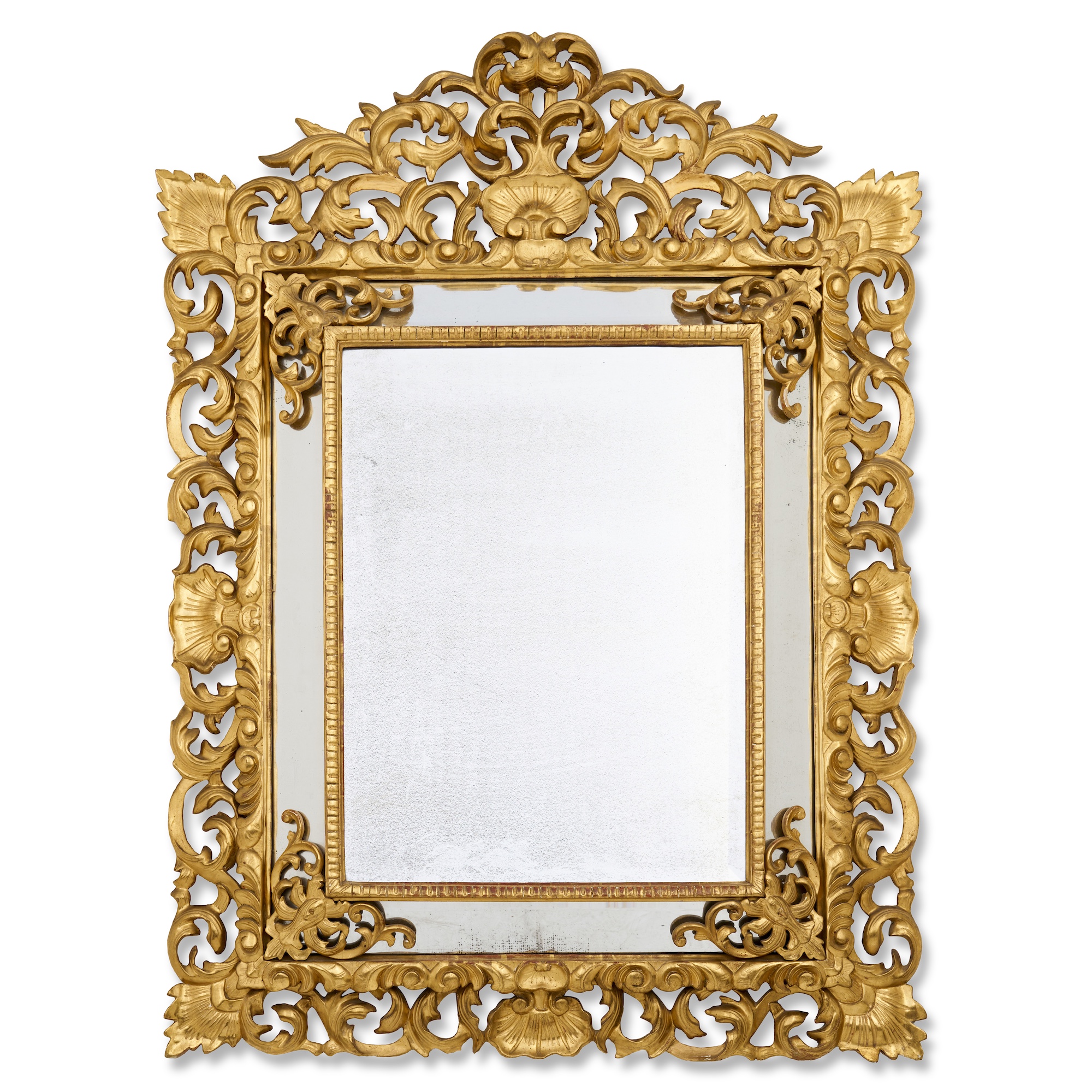 The bevelled rectangular main plate within receding marginal plates in a water-gilt carved and pierced frame of scrolling foliage around shell centres