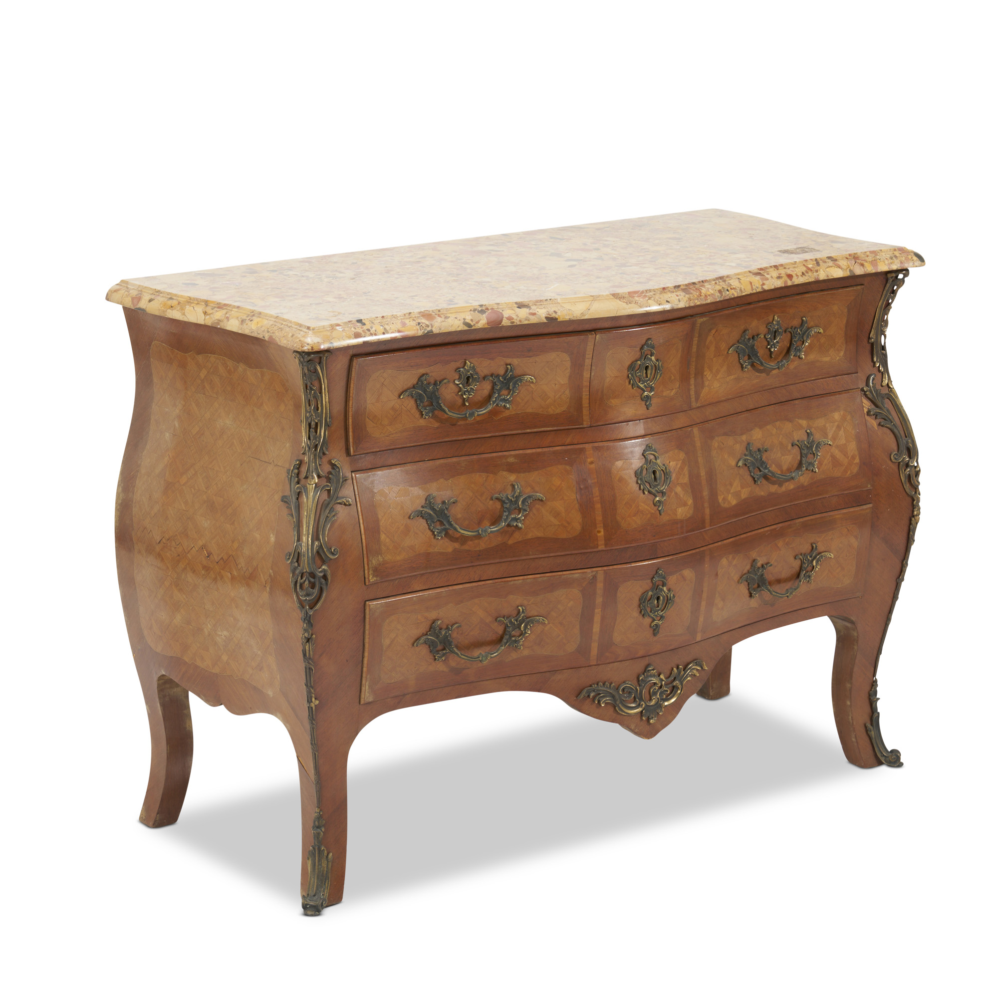 Of 'tombeau' shape, the thick breche d'Alep marble top with moulded edge above three short and two long drawers, on swept feet between shaped aprons, the front and sides veneered with geometric fields