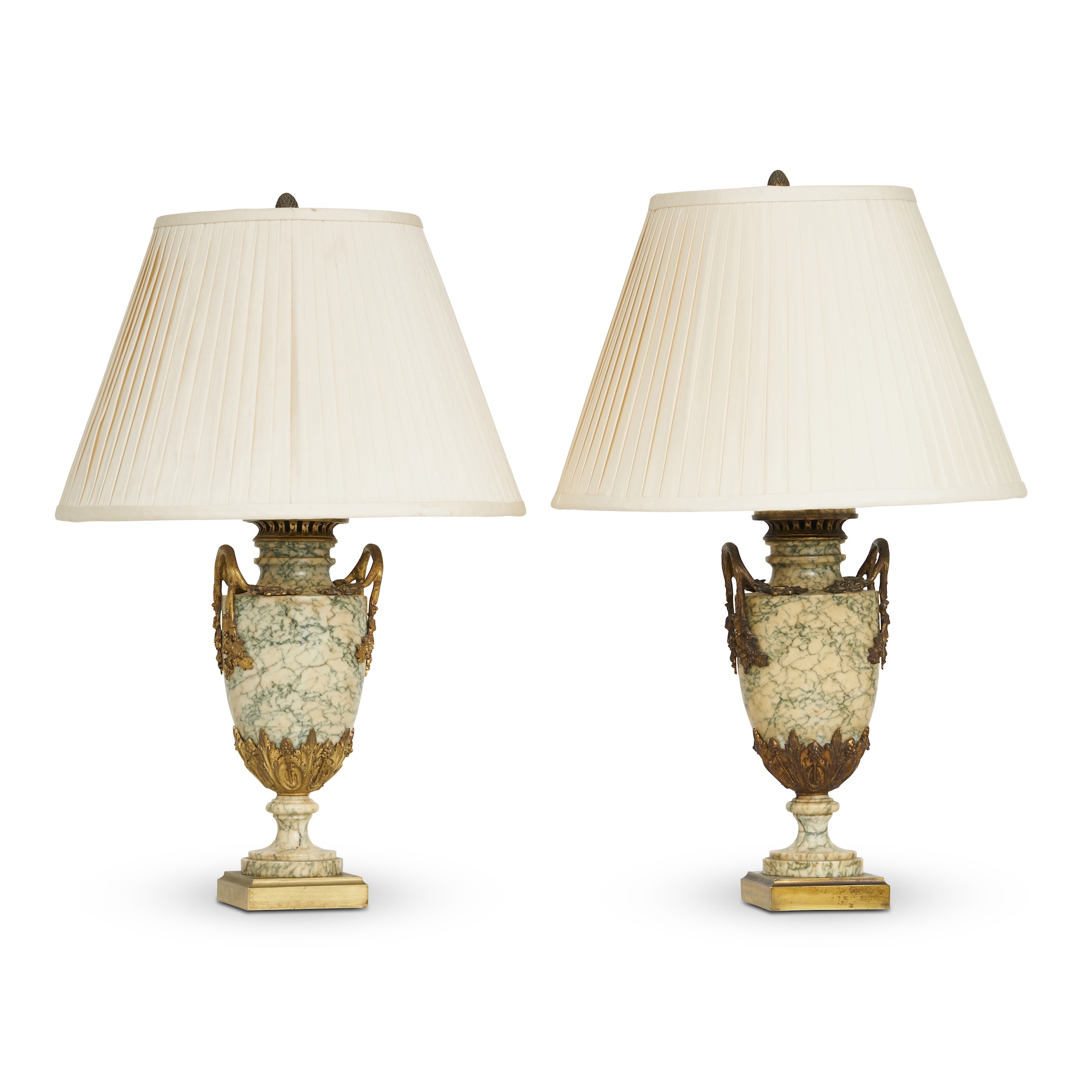 Each of Classical vase shape in green-veined white marble on a square bronze base, gilt bronze floral and foliate handles and mounts to the top and the base of the body, with pleated cream silk shades