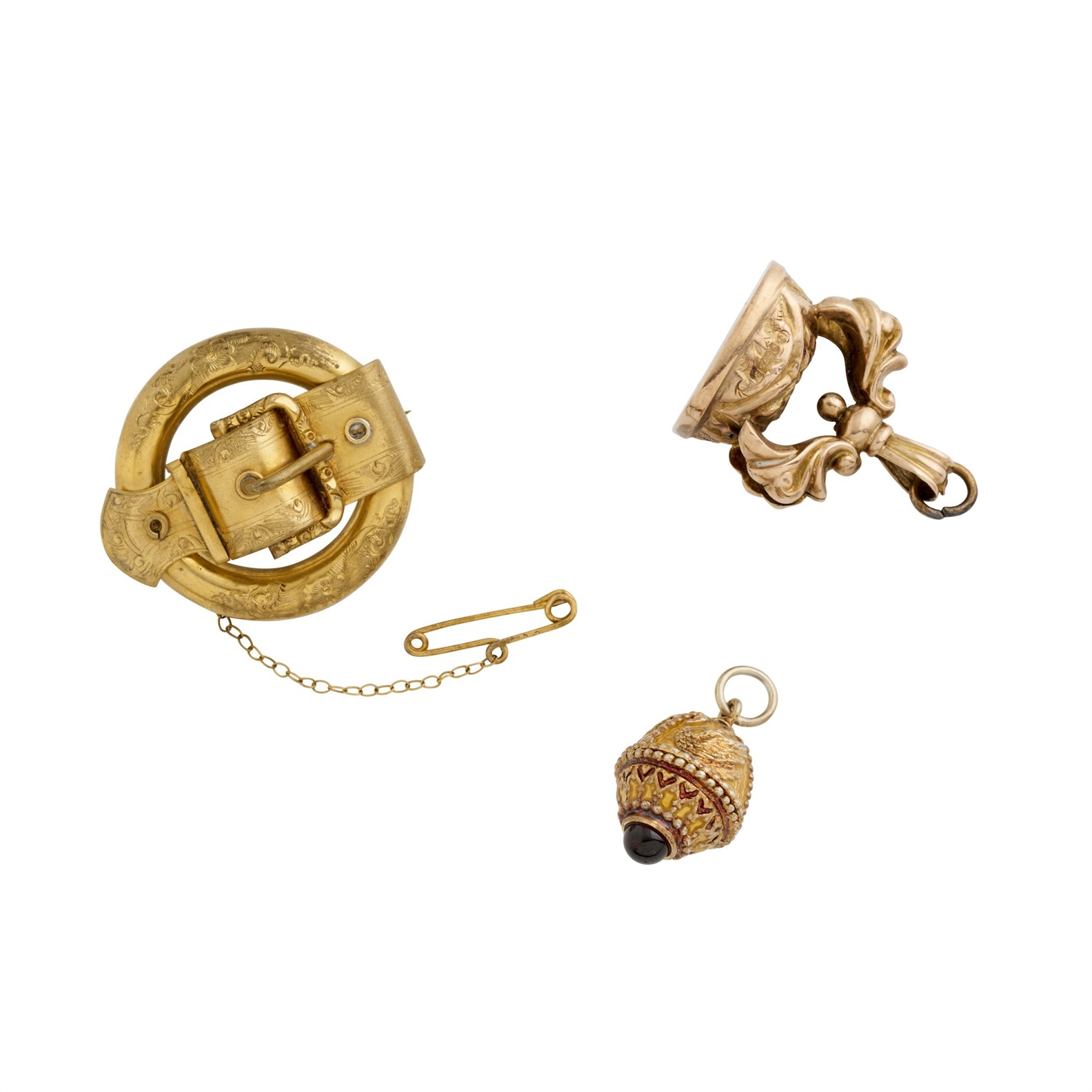Comprised of: a brooch of buckle design, mounted in base metal, a seal mounted in 9ct gold, and pendant mounted in base metal, brooch length 35mm, seal length 30mm, fob length 25mm, gross weight approximately 24.1 grams (seal 6.3 grams).