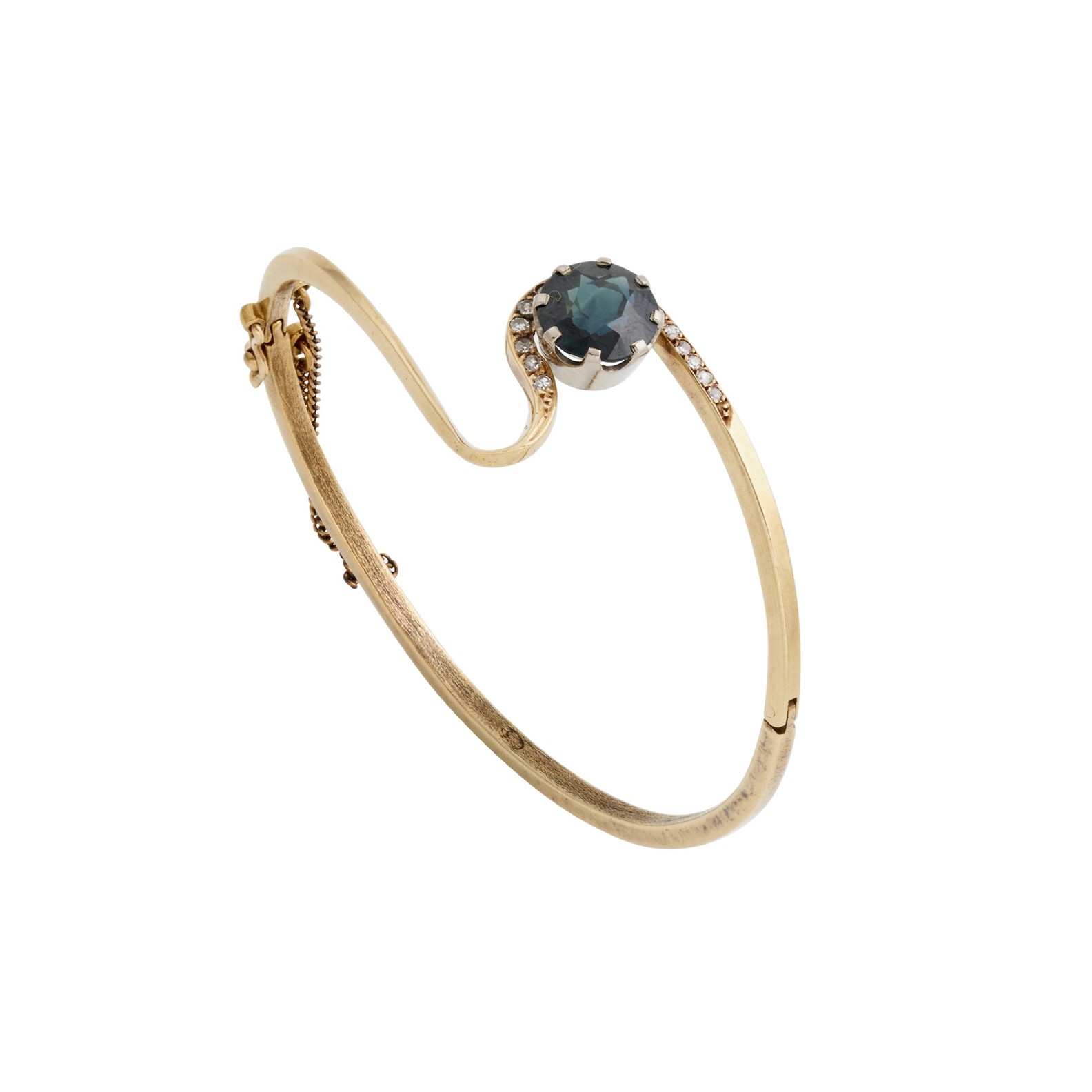 The oval hinged bangle centres a claw-set circular-cut bluish-green sapphire measuring approximately 9.15mm, to pavé-set single-cut diamond shoulders, the diamonds together weighing approximately 0.17 carats, mounted in 9ct gold, inner circumference 160mm, gross weight approximately 11.8 grams.