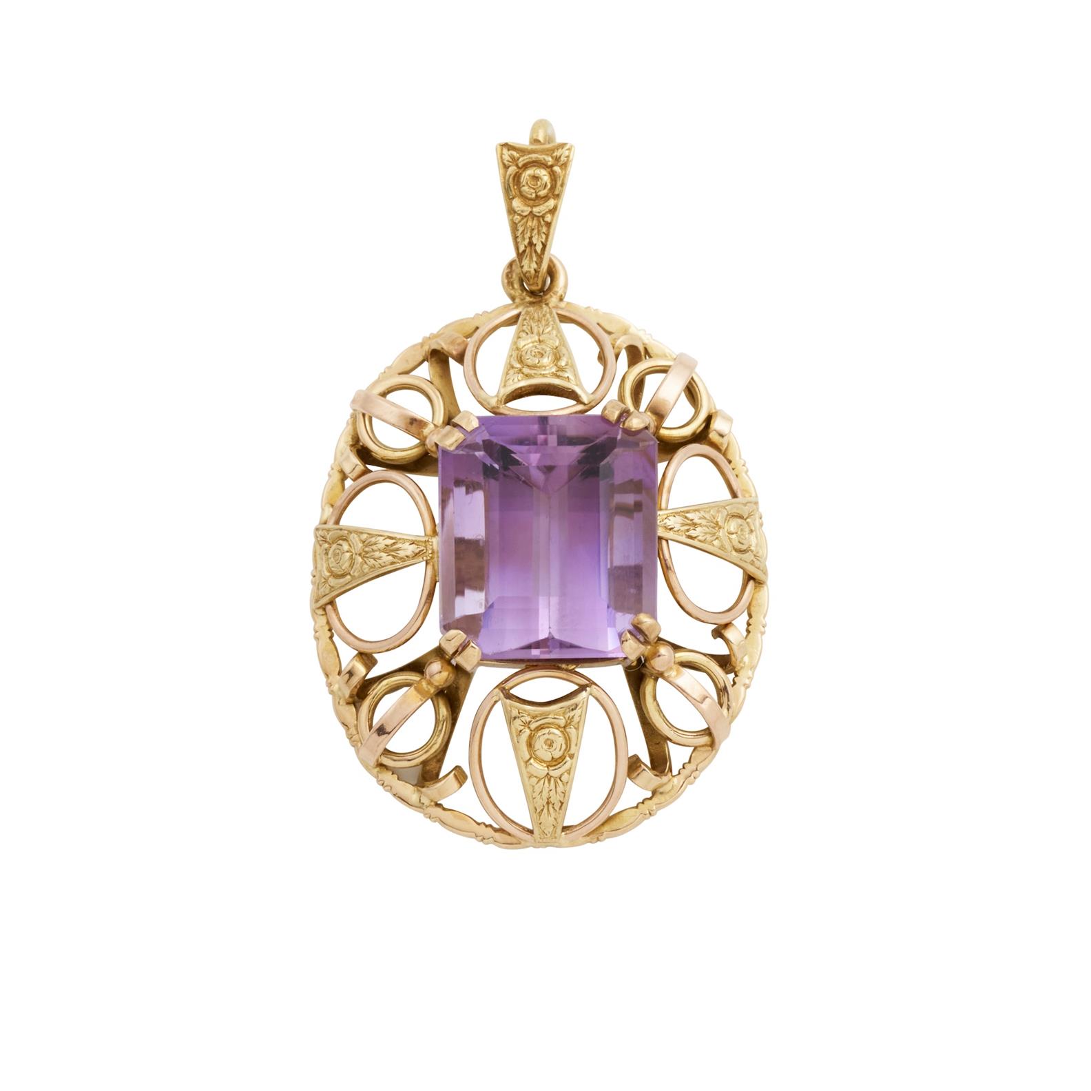 Centring a claw-set rectangular-cut amethyst measuring 15.3mm x 13.6mm within an ornate openwork frame, mounted in 15ct gold, length 45mm, gross weight approximately 10.5 grams.