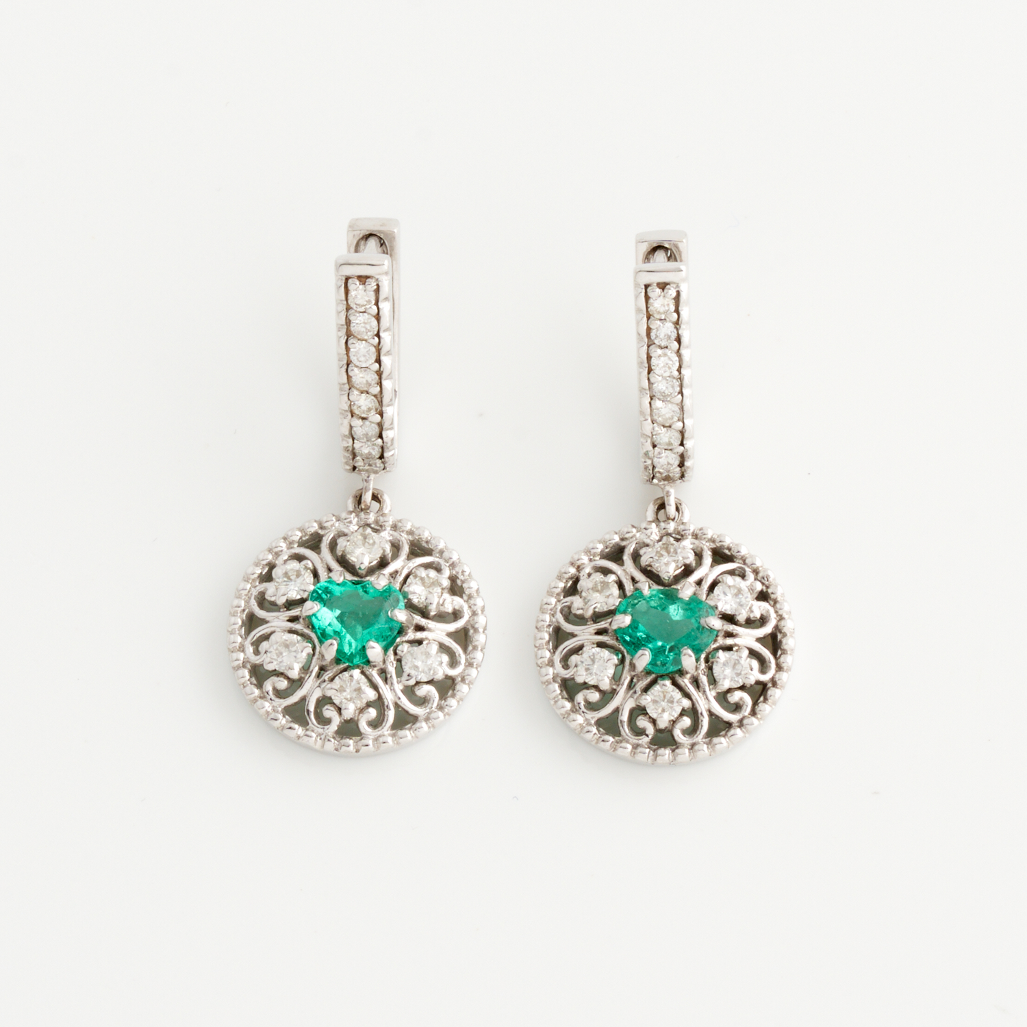 A PAIR OF COLOMBIAN EMERALD AND DIAMOND EARRINGS IN 18CT WHITE GOLD, EMERALDS TOTALLING APPROXIMATELY 1.26CTS AND DIAMONDS 0.90CT, DROP LENGTH 34MM, 10.06GMS, TO POST AND CLIPS FITTINGS, ACCOMPANIED BY A VALUATION