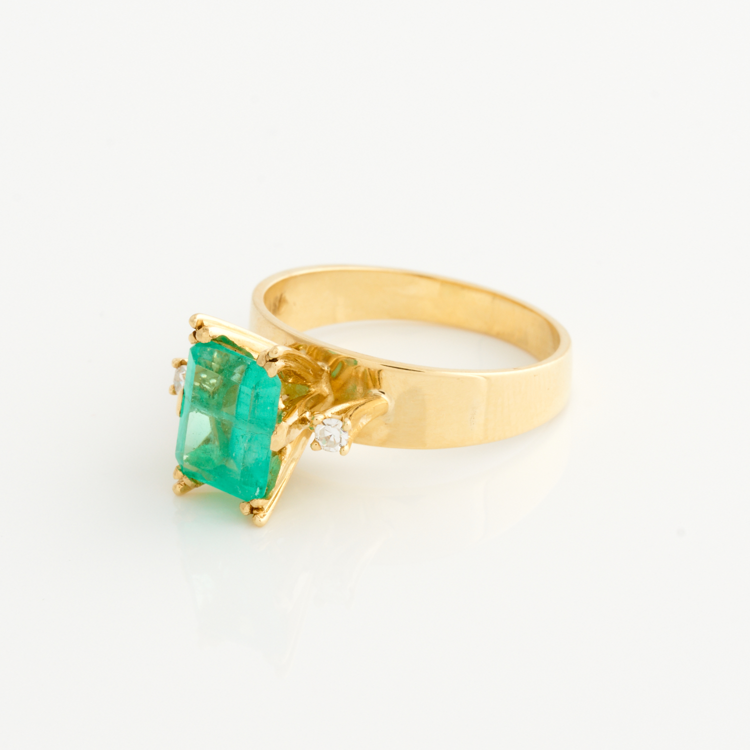 AN EMERALD AND DIAMOND RING IN 18CT YELLOW GOLD, THE EMERALD WEIGHING APPROXIMATELY 2.05CTS, SIZE Q, 5.84GMS.