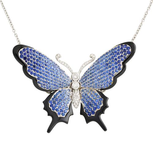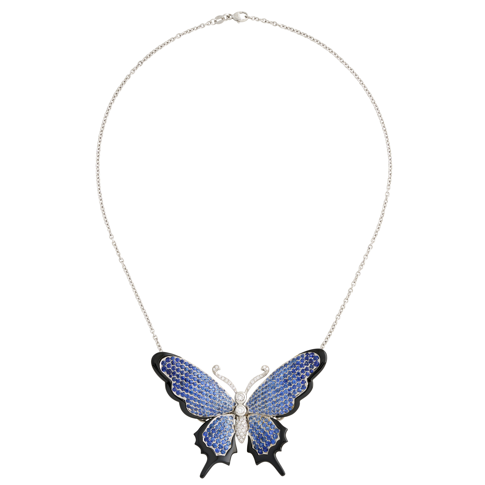 Modelled as an articulated butterfly, the body and antenna detailed with bezel, pavé and milgrain-set round brilliant-cut diamonds, the wings detailed with graduating pavé-set circular-cut sapphires in graduating blue hues within a border of polished onyx, the diamonds together weighing approximately 0.75 carats, the sapphires together weighing approximately 10.30 carats, to a double platinum chain completed by a parrot clasp, pendant length 55, width 76mm, necklace length 430mm, gross weight approximately 43.4 grams.