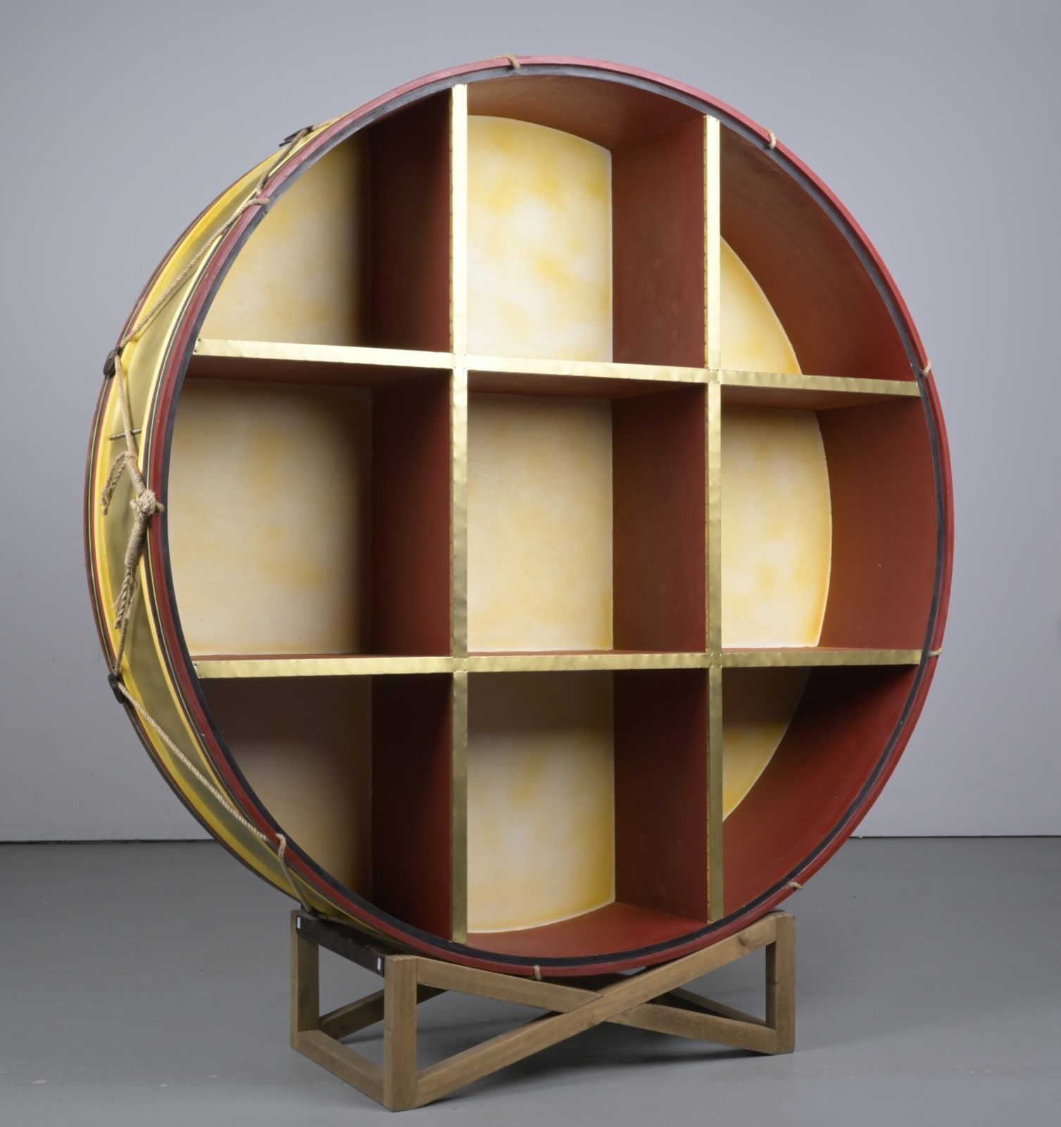 A LARGE DRUM OPEN DISPLAY CABINET (202CM H X 183CM DIA) (THIS ITEM MUST BE REMOVED BY CARRIERS AT THE CUSTOMER'S EXPENSE. LEONARD JOEL STAFF CANNOT ASSIST CARRYING THIS ITEM)