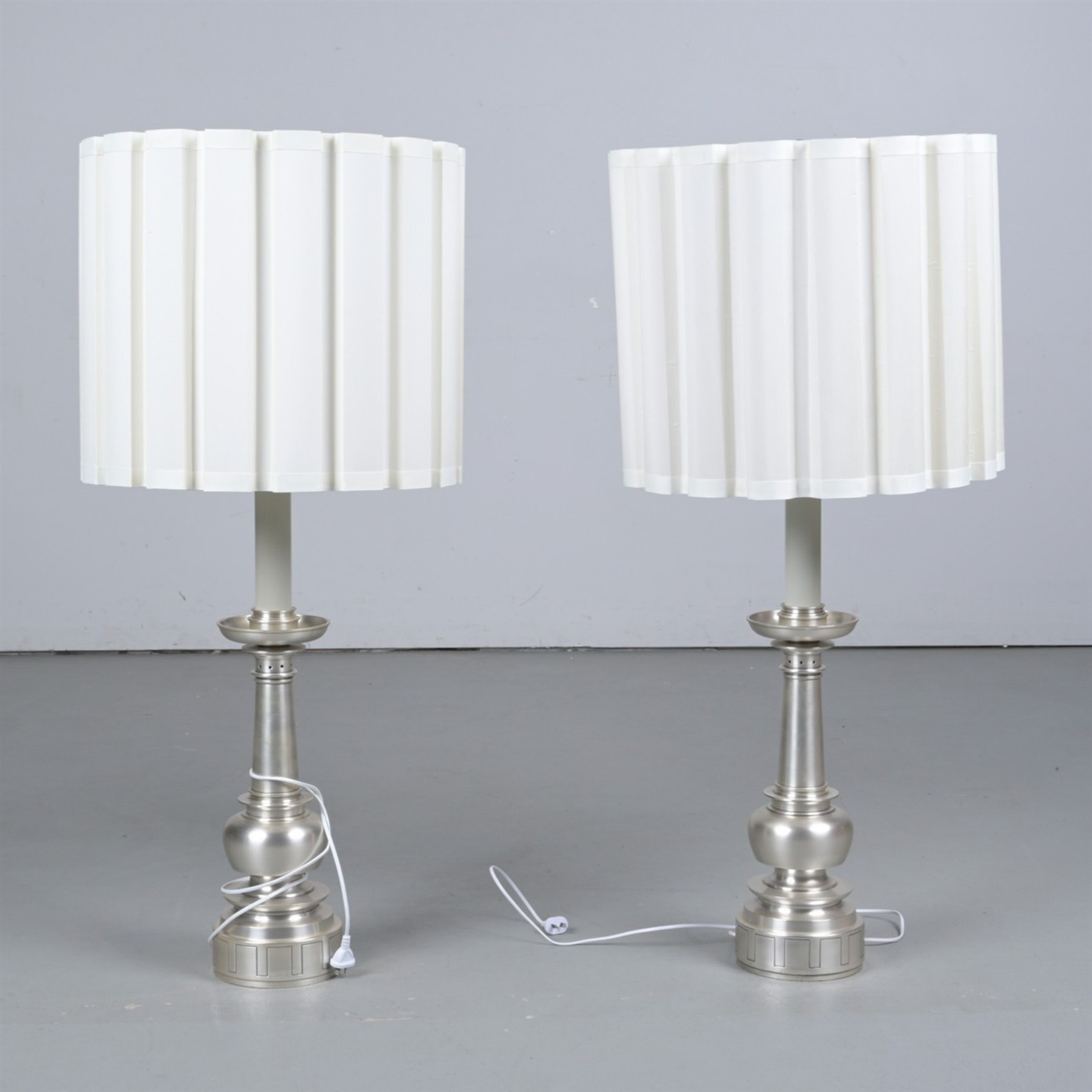 A PAIR OF PEWTER TABLE LAMPS WITH SILK SHADES (120CM H X 52DIA CM)