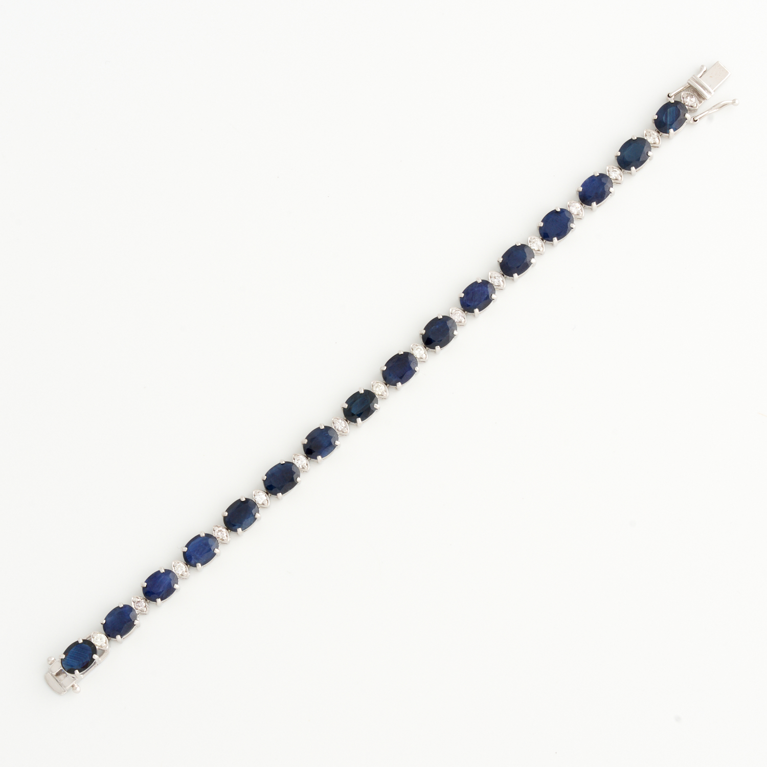 A SAPPHIRE AND DIAMOND BRACELET IN 18CT WHITE GOLD, THE SAPPHIRES TOTALLING APPROXIMATELY 24.80CTS, THE DIAMONDS TOTALLING APPROXIMATELY 1.00CTS, TO A TONGUE AND GROOVE CLASP, 180MM, 17.45GMS, ACCOMPANIED BY A VALUATION
