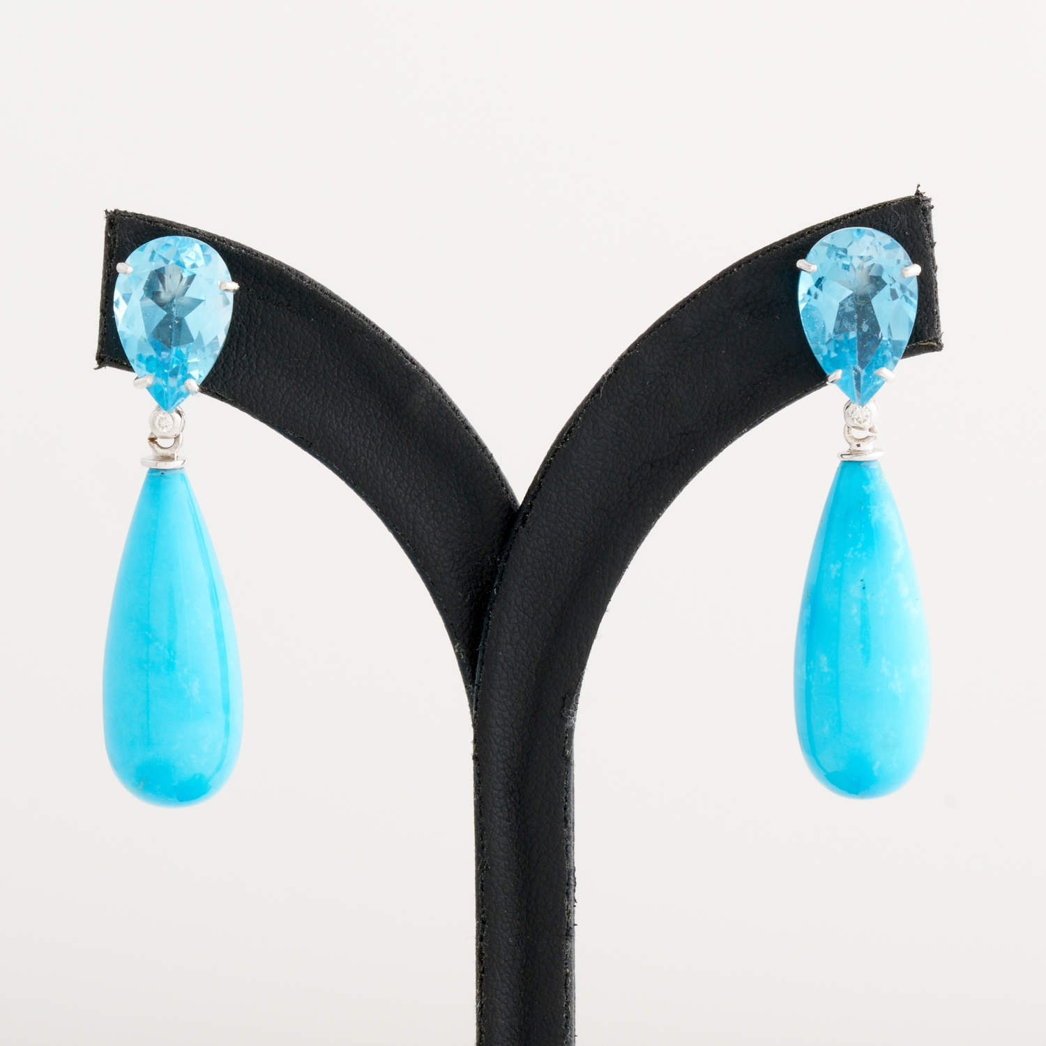 A PAIR OF TURQUOISE, BLUE TOPAZ AND DIAMOND EARRINGS IN 18CT WHITE GOLD, THE BLUE TOPAZ WEIGHING 14.20CTS, TO POST AND BUTTERFLY FITTINGS, 45MM, 14.48GMS