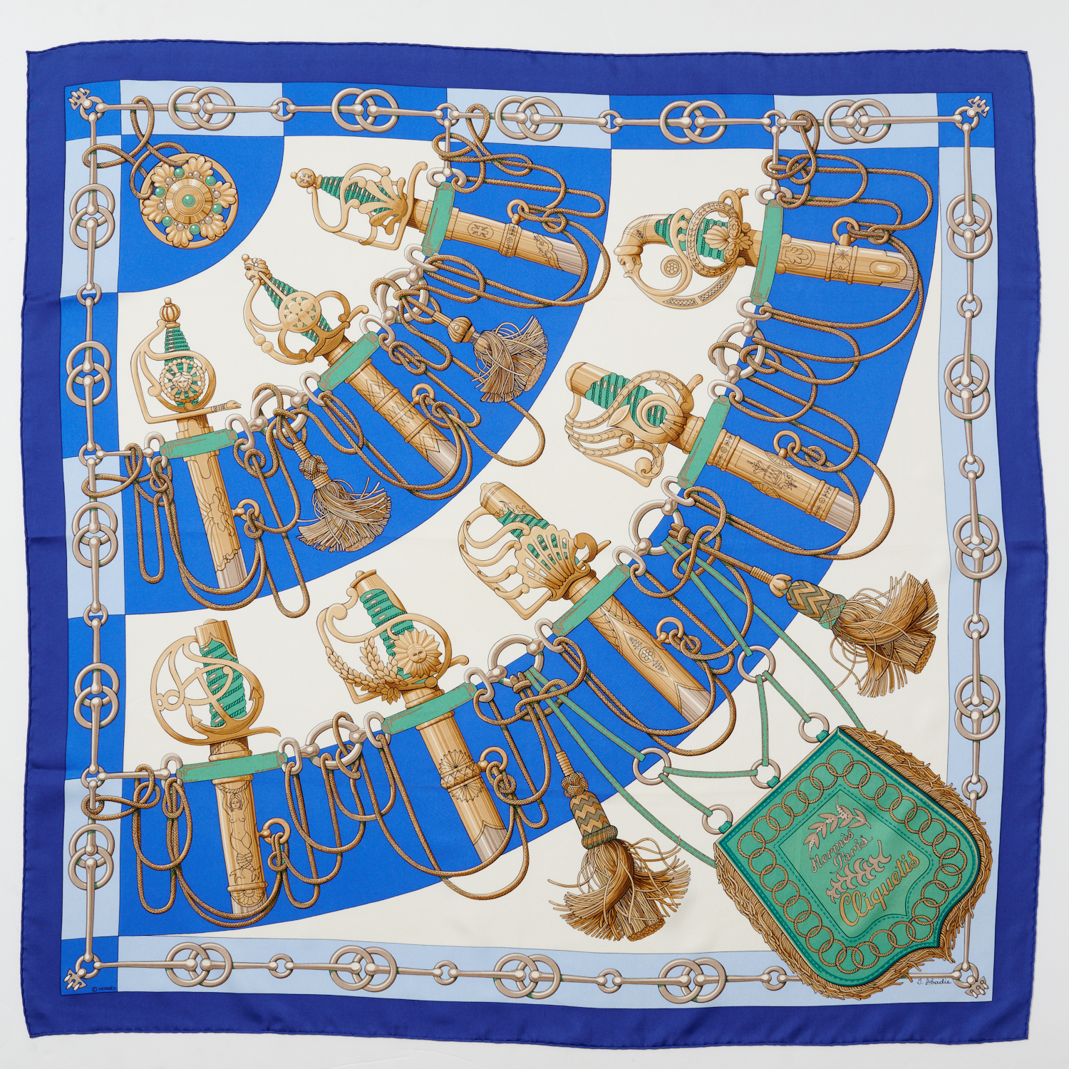 Design by Julia Abadie, styled in silk twill of blue, ivory, green and gold tones, measures 90cm. From a private single-owner collection.