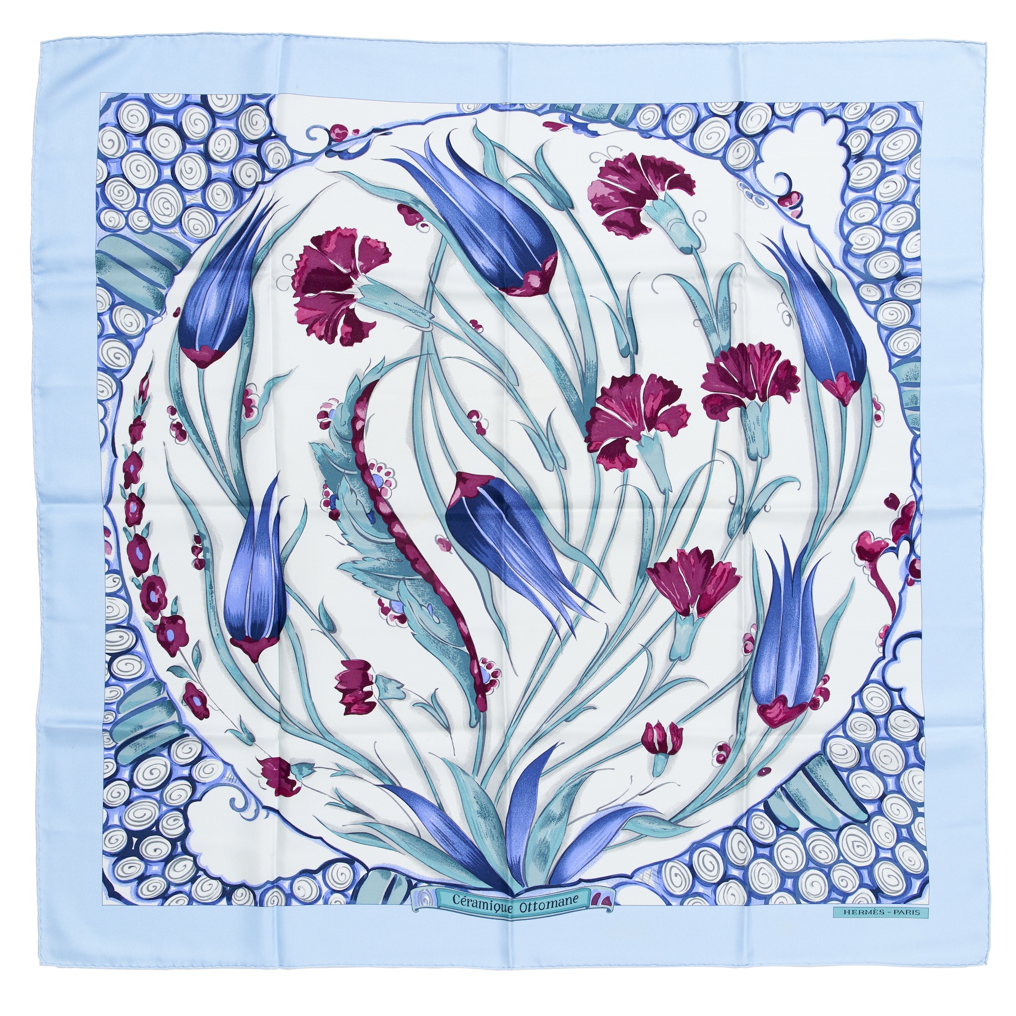 Design by Laurence Bourthoumiex with a tulip motif in tones of sky blue, white and raspberry, measures 90 cm. From a private single-owner collection.