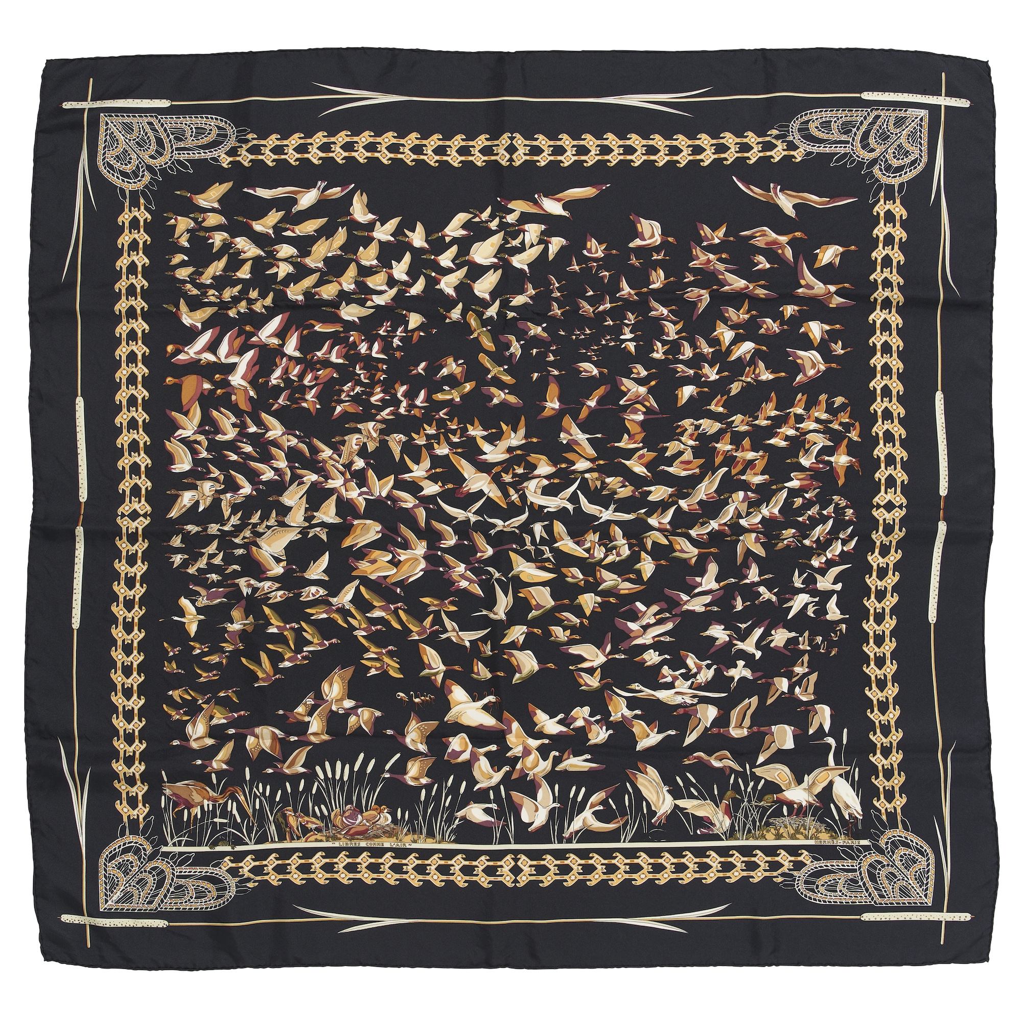 Design by Annie Faivre depicting birds in flight in tones black, gold and white, measures 90 cm. From a private single-owner collection.