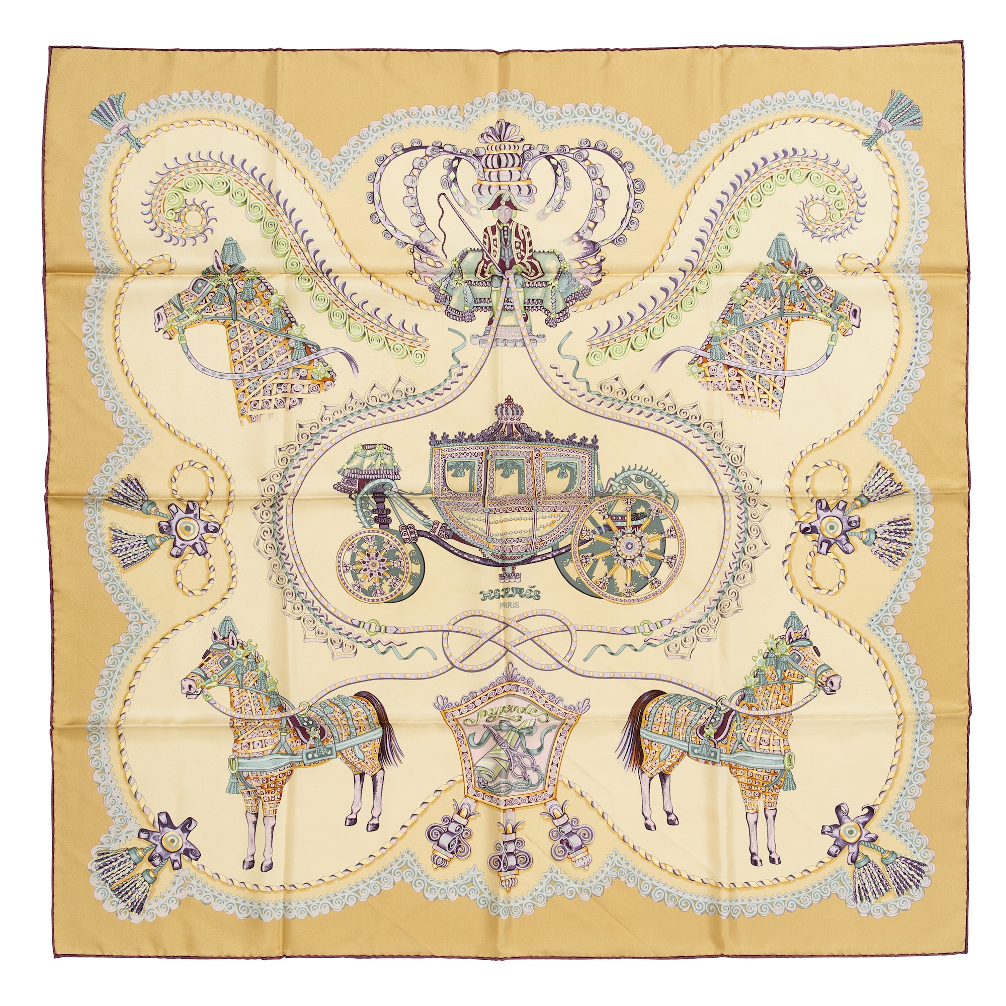 Design by Annie Faivre depicting ornate house and carriage in pastel shades of lavender, muted yellow and celadon, measures 90 cm. From a private single-owner collection.