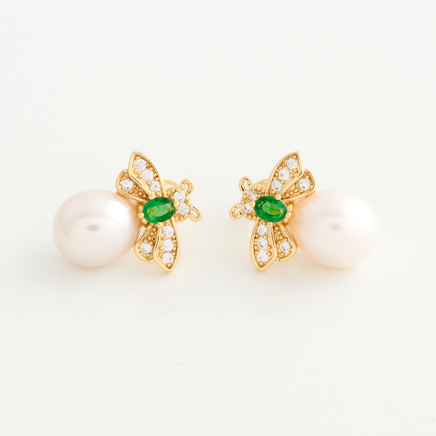 A PAIR OF BEE-FORM PEARL AND GEM-SET EARRINGS IN SILVER GILT, TO POST AND RUBBER FITTINGS, 12MM, 4.7GMS