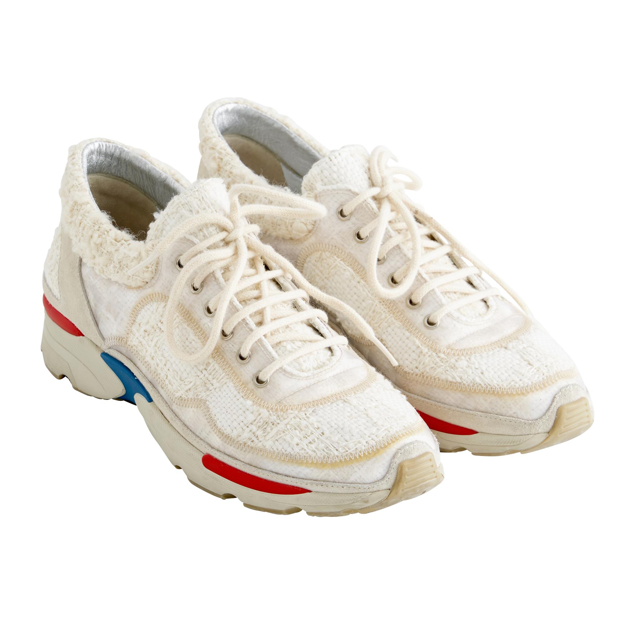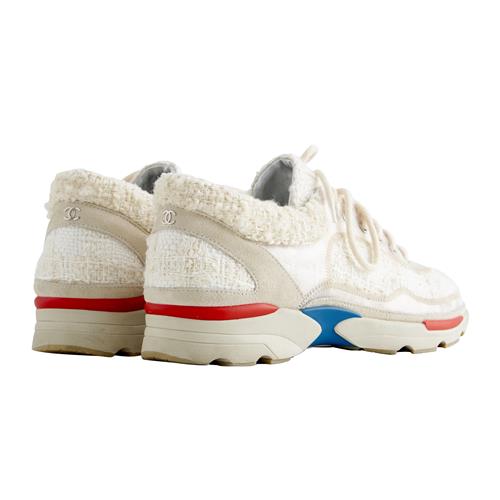 Styled in ivory tweed with tonal suede overlay and transparent PVC accents set on a tricolor rubber sole in red, white and blue, marked size 36.5