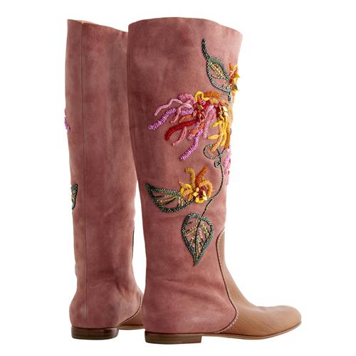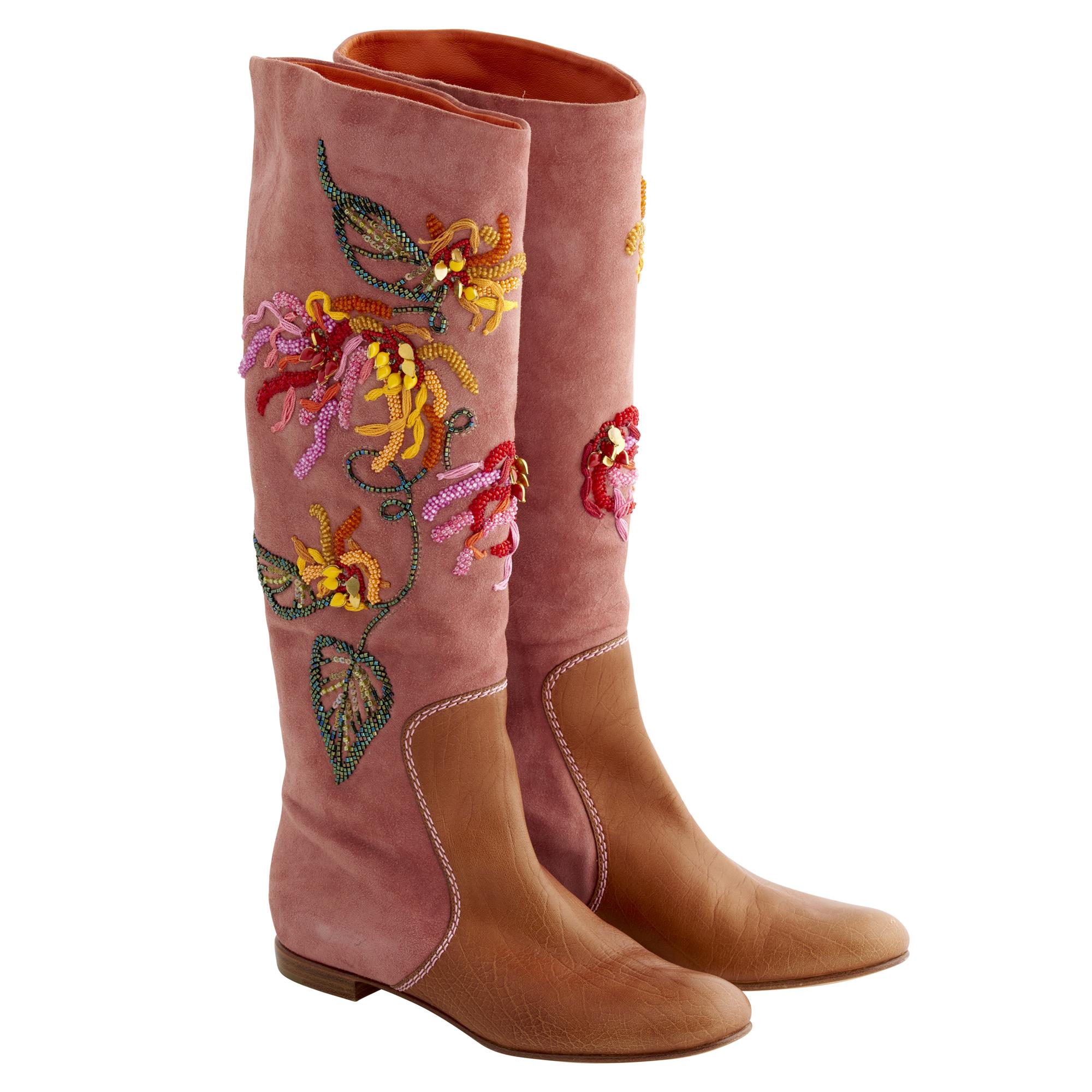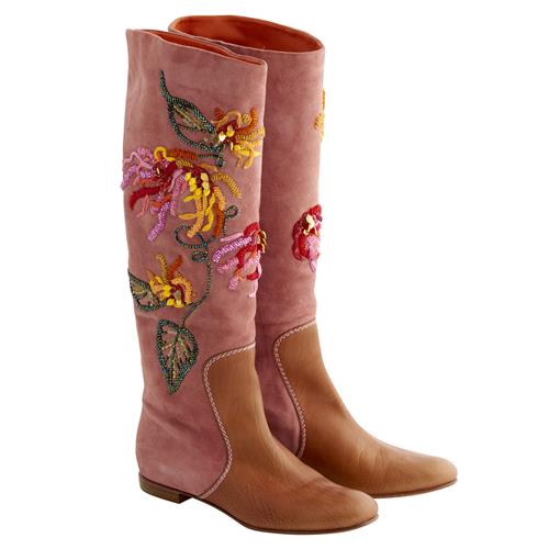 Styled in pink suede with tan leather foot and heel, featuring multicolour floral bead embroidery, set on a flat sole with rounded toe, marked size 37.