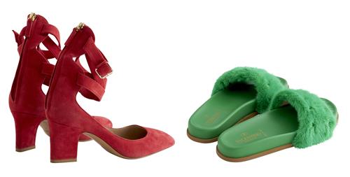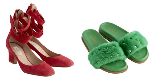 Comprising of a pair green slides styled in mink fur and leather featuring signature pyramid stud detail, marked size 37; together with a pair of red suede ballerina shoes styled in red suede leather designed with multiple straps at ankle, marked size 37.