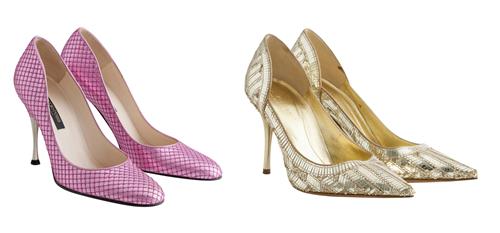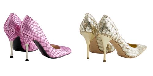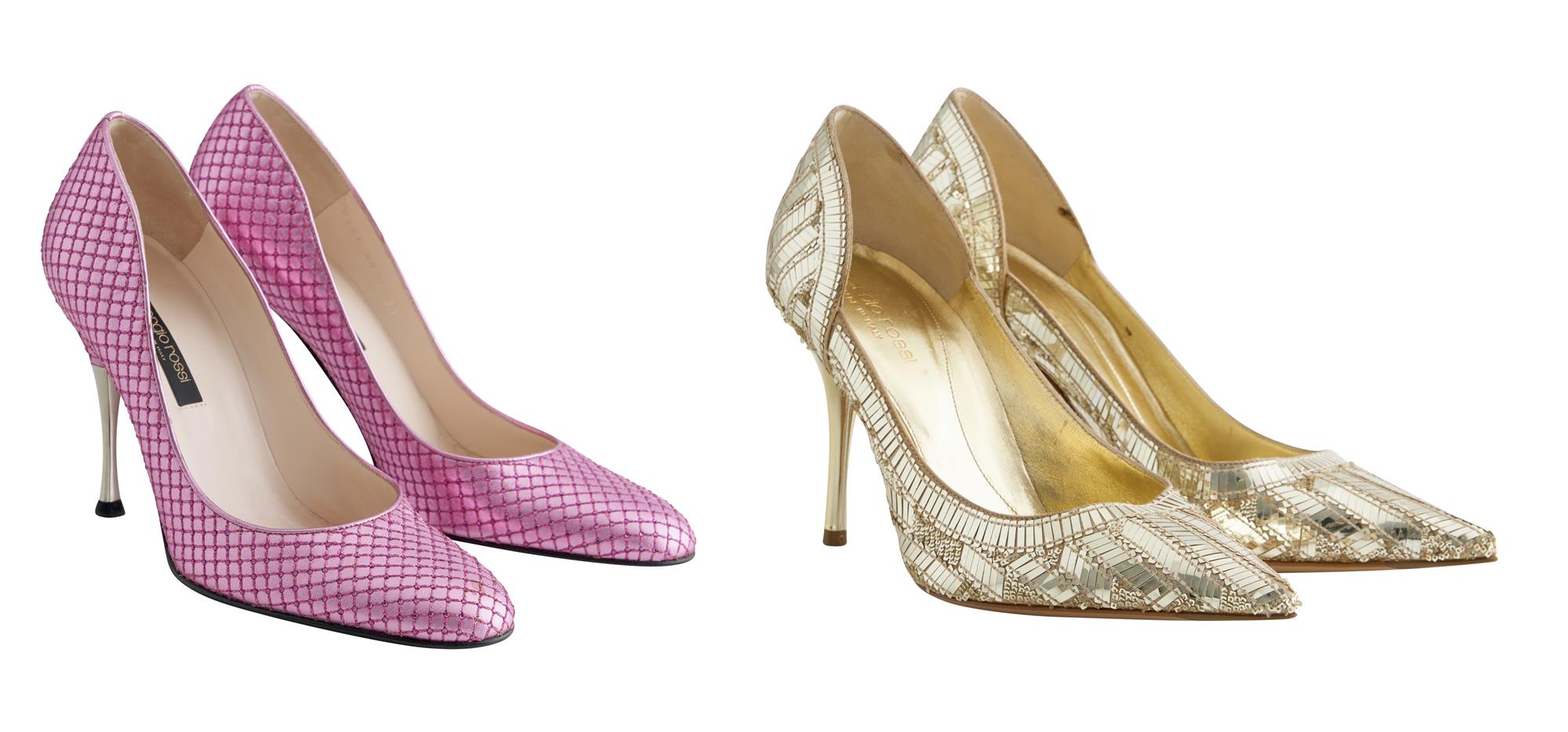 Comprising of a pair of gold sequined leather pumps, designed with a pointed toe and mirror-finish stiletto heel measuring 9 cm, marked size 38; together with a pair of metallic pink woven-effect leather pumps, designed with a pointed toe and stiletto heel measuring 9cm, marked size 37.