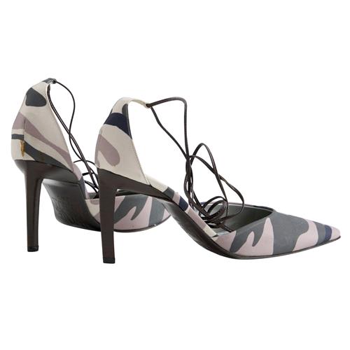 Styled in satin camouflage print, with wrap-around lace ties and stiletto heel measuring 6cm, marked size 36.5.