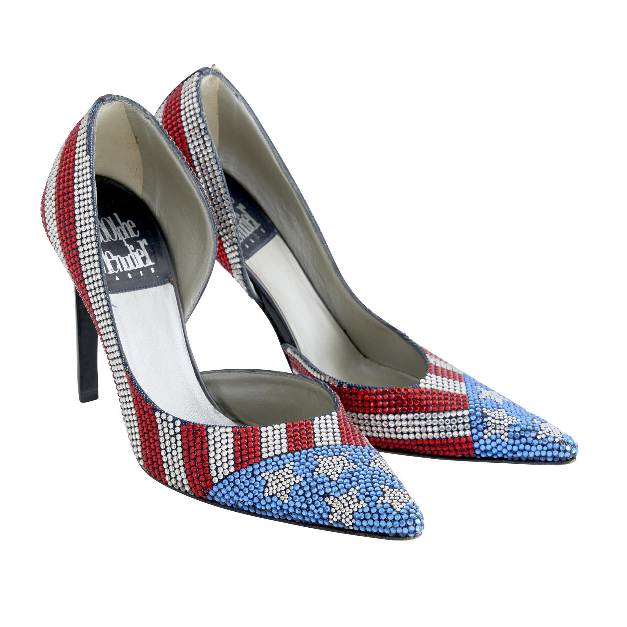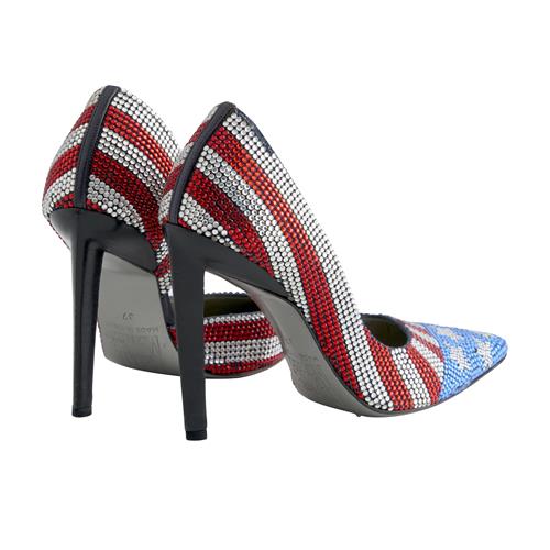 Styled in leather and embellished with red, blue, and silver crystals in an American flag motif, designed with stiletto heel measuring 9cm, marked size 37.