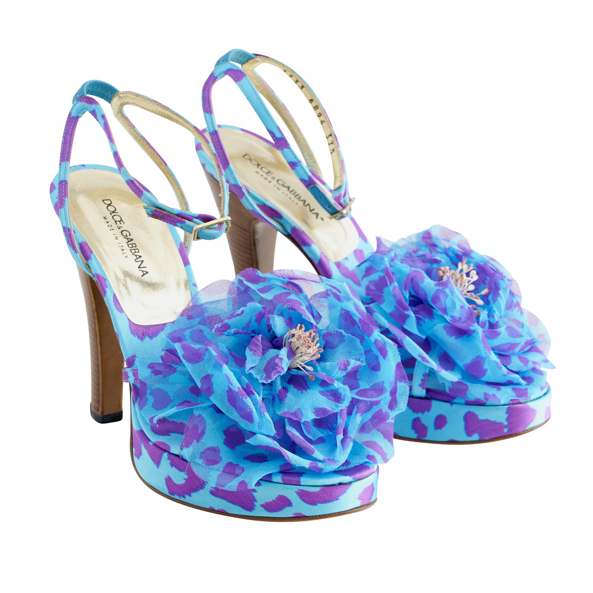 Styled in blue and purple silk chiffon featuring oversized floral applique at the toe, designed with a lacquered wood stiletto heel measuring 10cm, marked size 37.5.