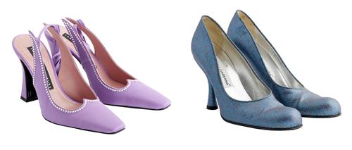 Comprising of a pair of Dolce and Gabbana pumps styled in teal, green and red glitter, designed with heel measuring 9cm, marked size 37.5cm; together with a pair of Petite De Jour pumps styled in purple satin with rhinestone trim, designed with ankle wrap ties, pointed toe and flared stiletto heel measuring 10cm, marked size 37.