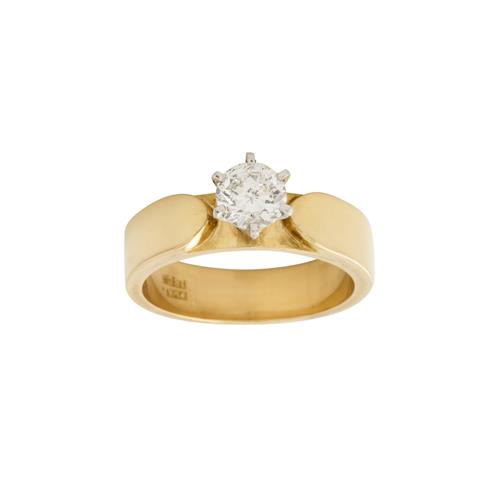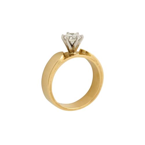 Centring a claw-set brilliant-cut diamond weighing approximately 0.80 carats, mounted in 18ct gold and platinum, size N, gross weight approximately 7.7 grams.