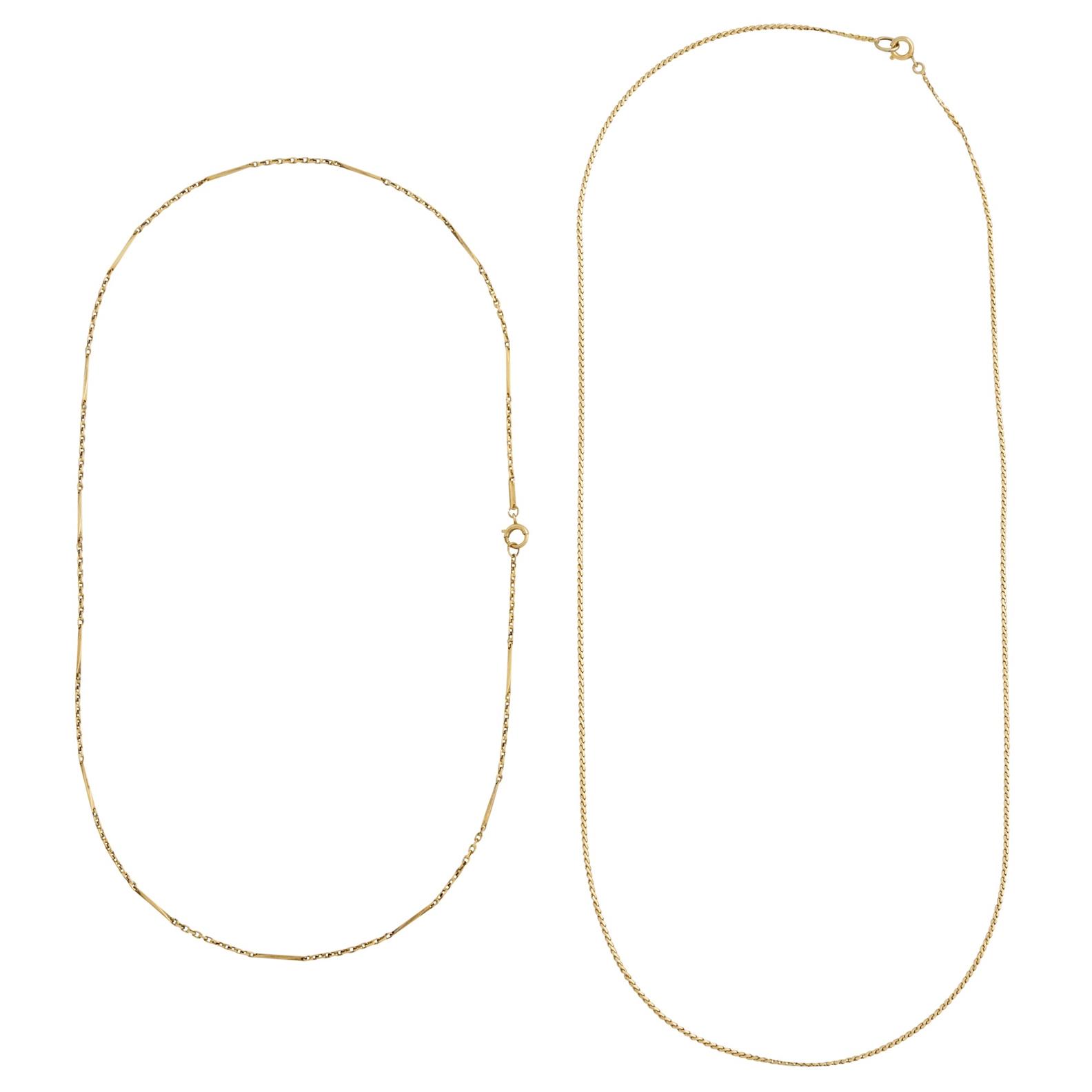 Consisting of one 18ct gold serpentine link chain and one 10ct gold bar and link chain, length 550mm and 450mm, respectively, gross weight approximately 8.1 grams.