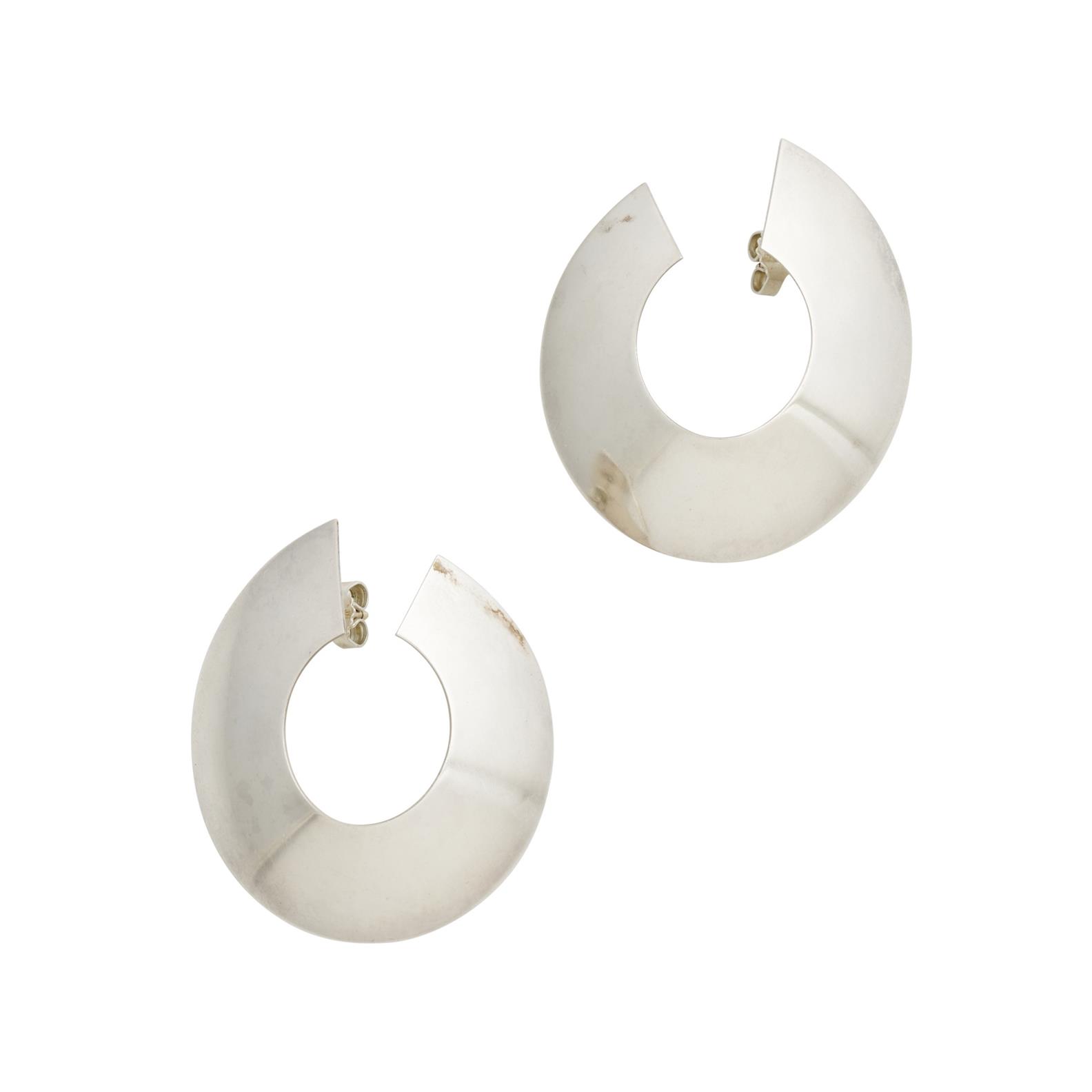 Each of modernist circular design, mounted in sterling silver, post and scroll fittings, length 35mm, gross weight approximately 19.5 grams, signed Georg Jensen 377.