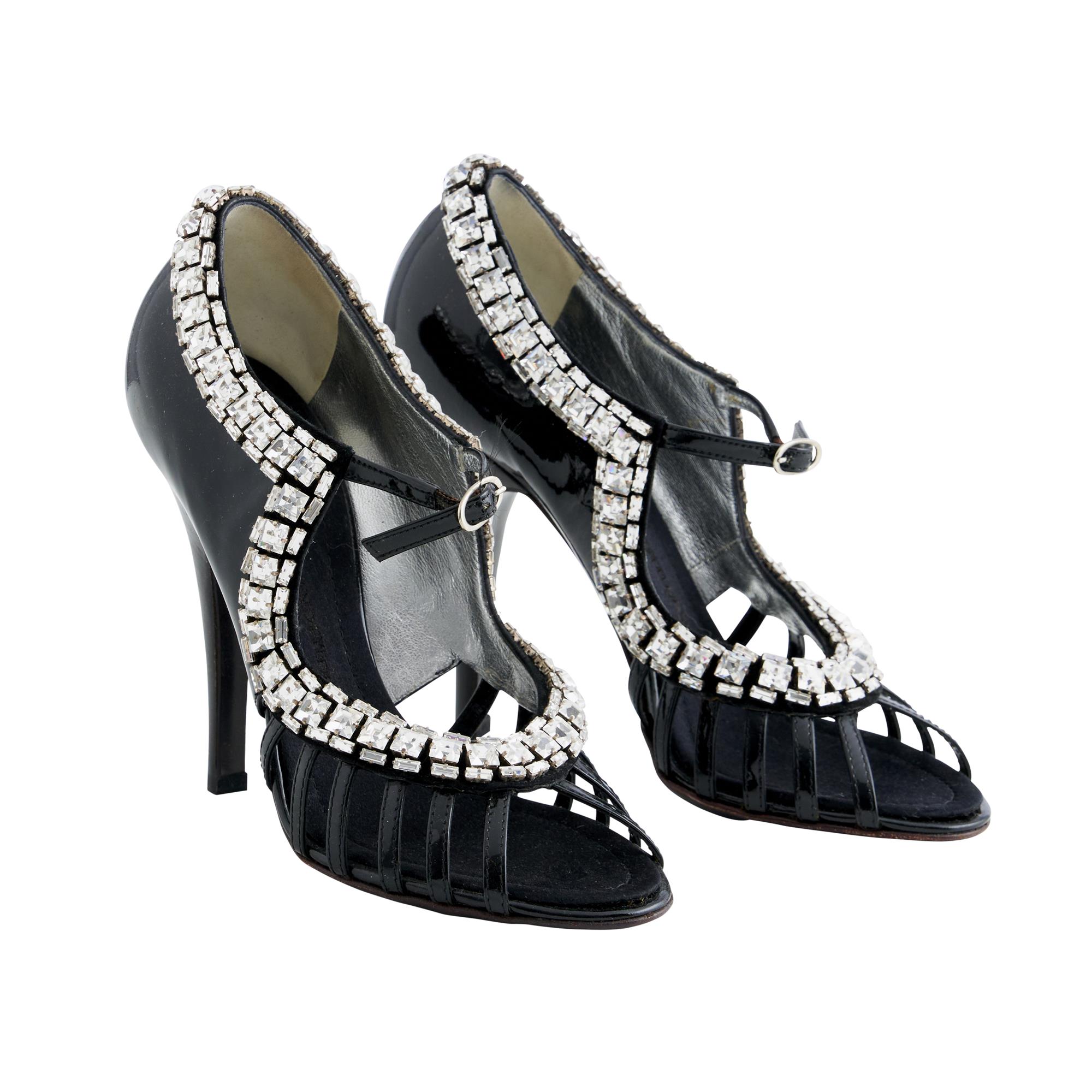 Styled in black patent leather with crystal embellishments, designed with peep toe, mary jane strap and stiletto heel measuring 10cm, marked size 37.5.