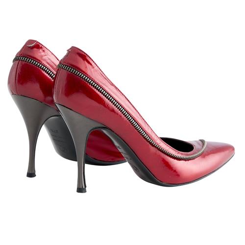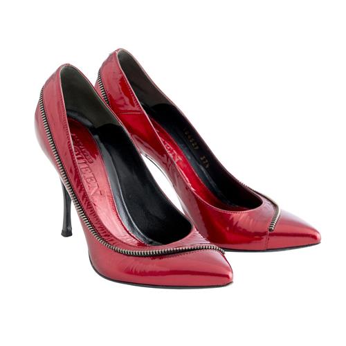 Styled in red metallic patent leather featuring wrap around zip detail in black tone metal, designed with pointed toe and heel height measuring 9cm, marked size 37.