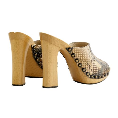 Styled in snake leather with wooden base, heel measuring 10cm, marked size 38.