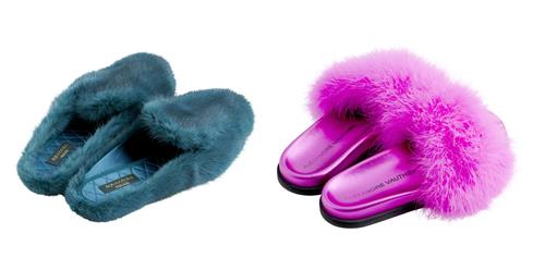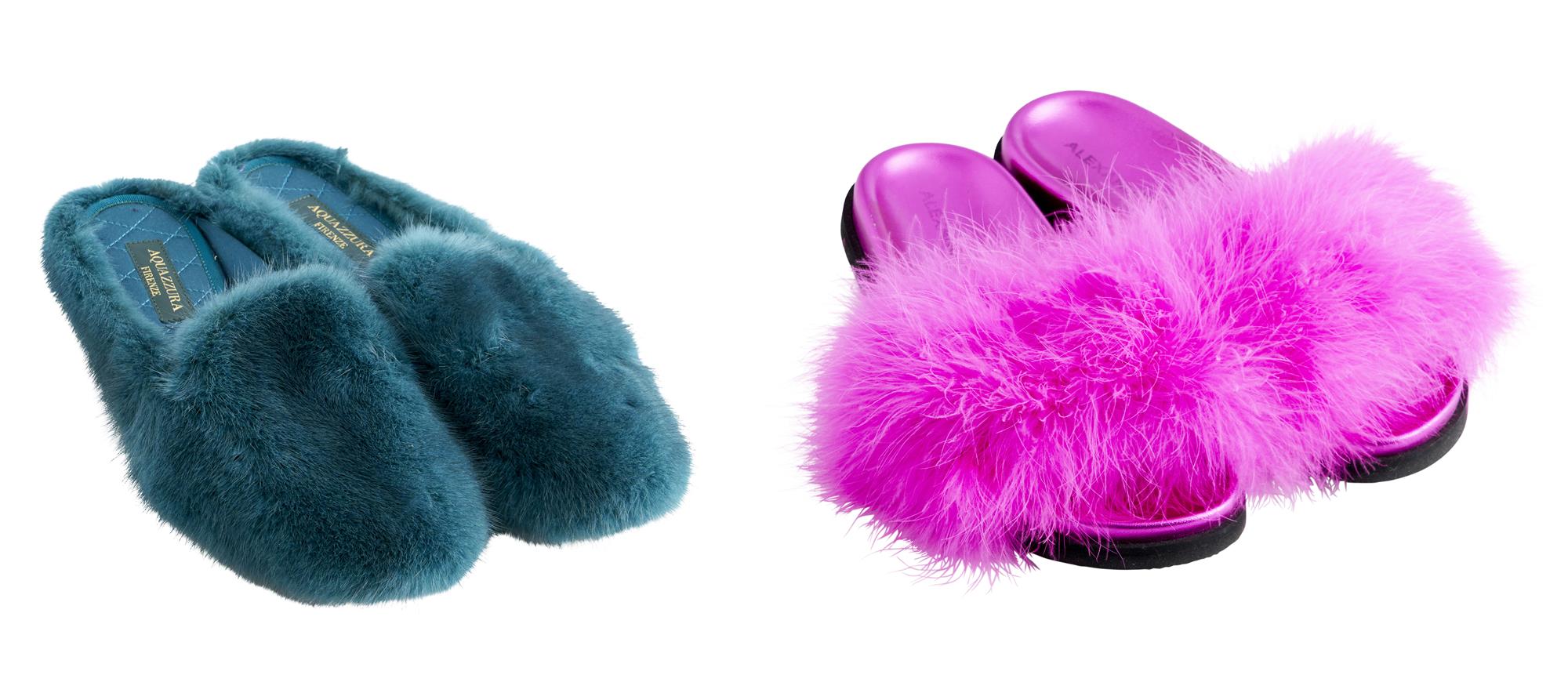 Comprising of a pair of Alexandre Vauthier slides styled in fuschia leather with marabou feather trim, marked size 37; together with a pair of Aquazzura teal mink slip ons, marked size 37.5.