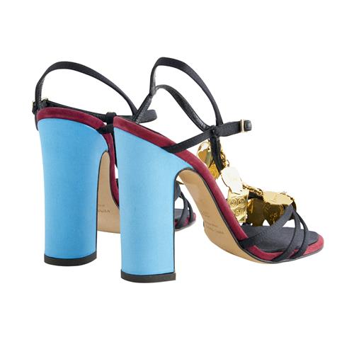 Styled in black silk accented with pink and blue across sole and heel, featuring gold tone metal charms, designed with block heel measuring 10cm, marked size 37.