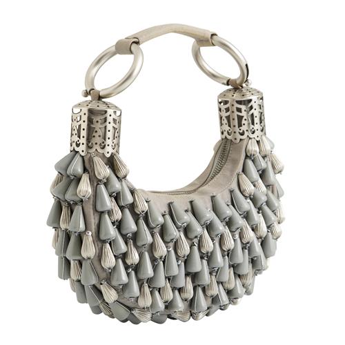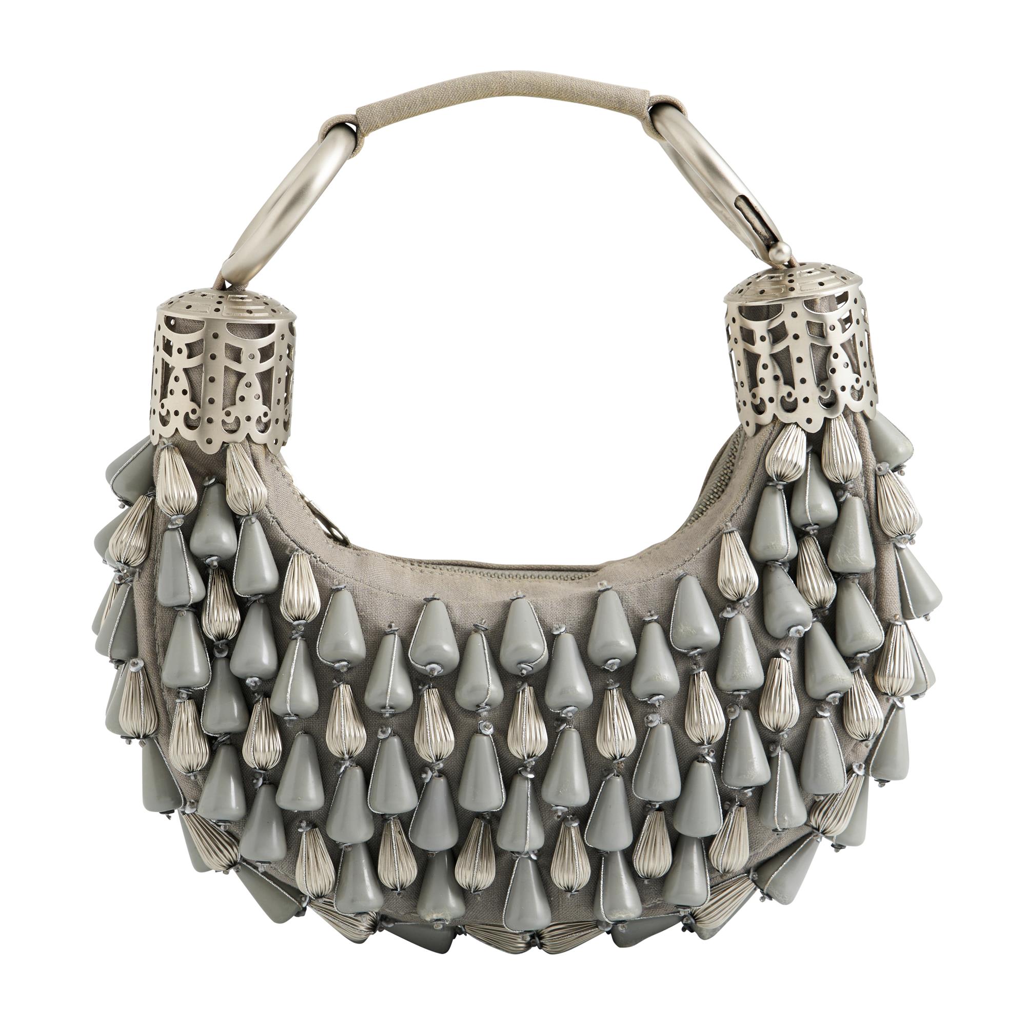 Styled in grey canvas adorned with teardrop beads in grey resin and carved silver tone metal beads, finished with oversized filigree silver tone metal caps and rings, measures 23 x 13 x 5 cm.
