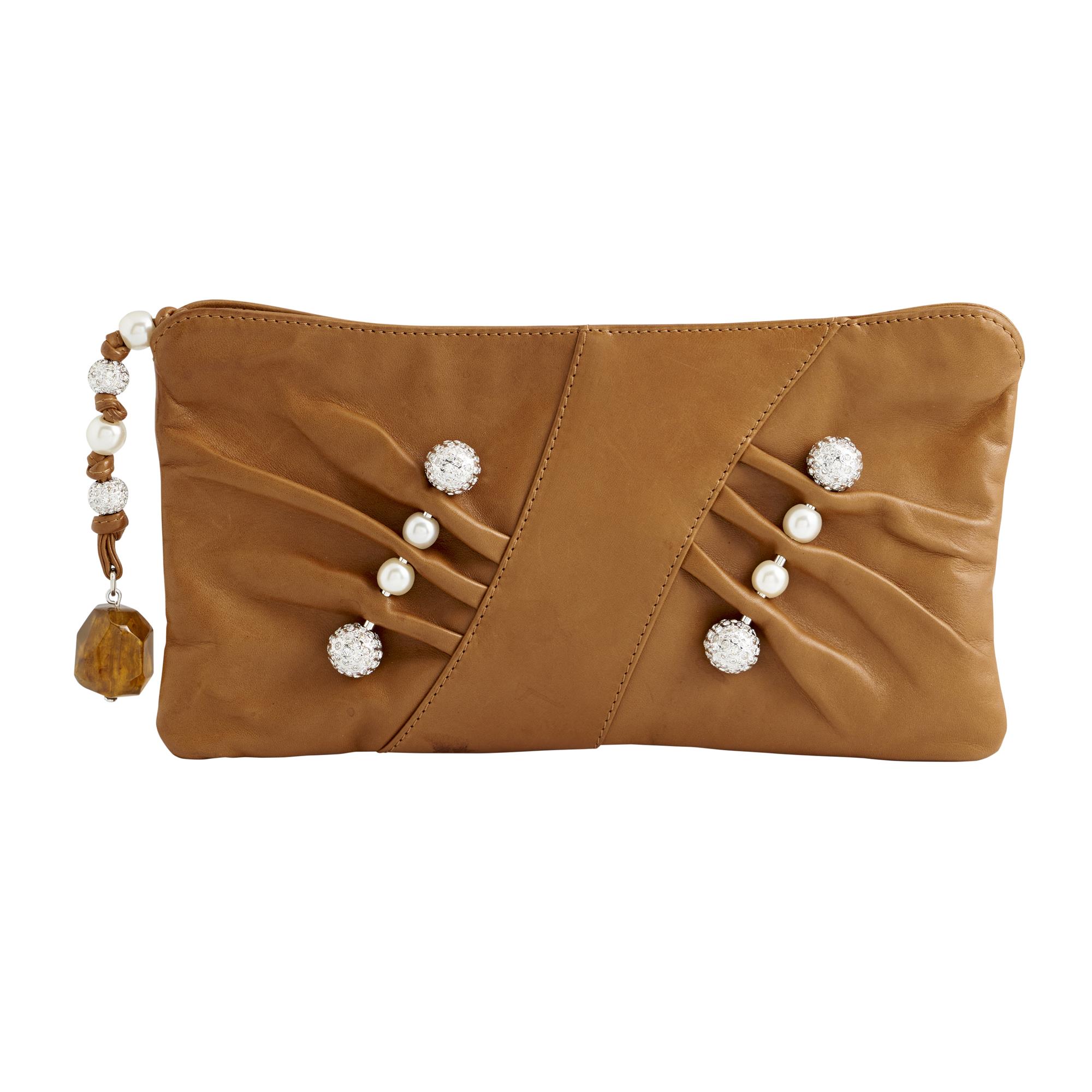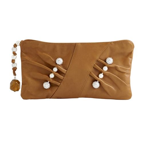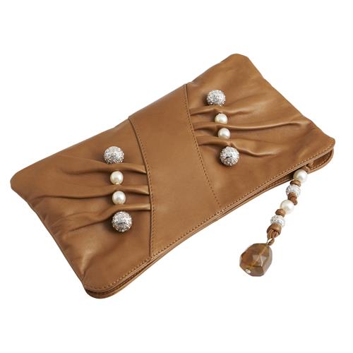 Styled in tan leather with pleated detailing, embellished with alternating faux pearl and pave crystal dome studs arranged in diagonal lines, measures 32 x 16 x 1cm.
