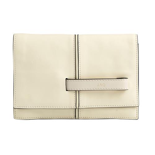 Styled in cream leather with minimalist folded construction and a signature slip-through strap panel detail, measures 24 x 18 x 7cm.