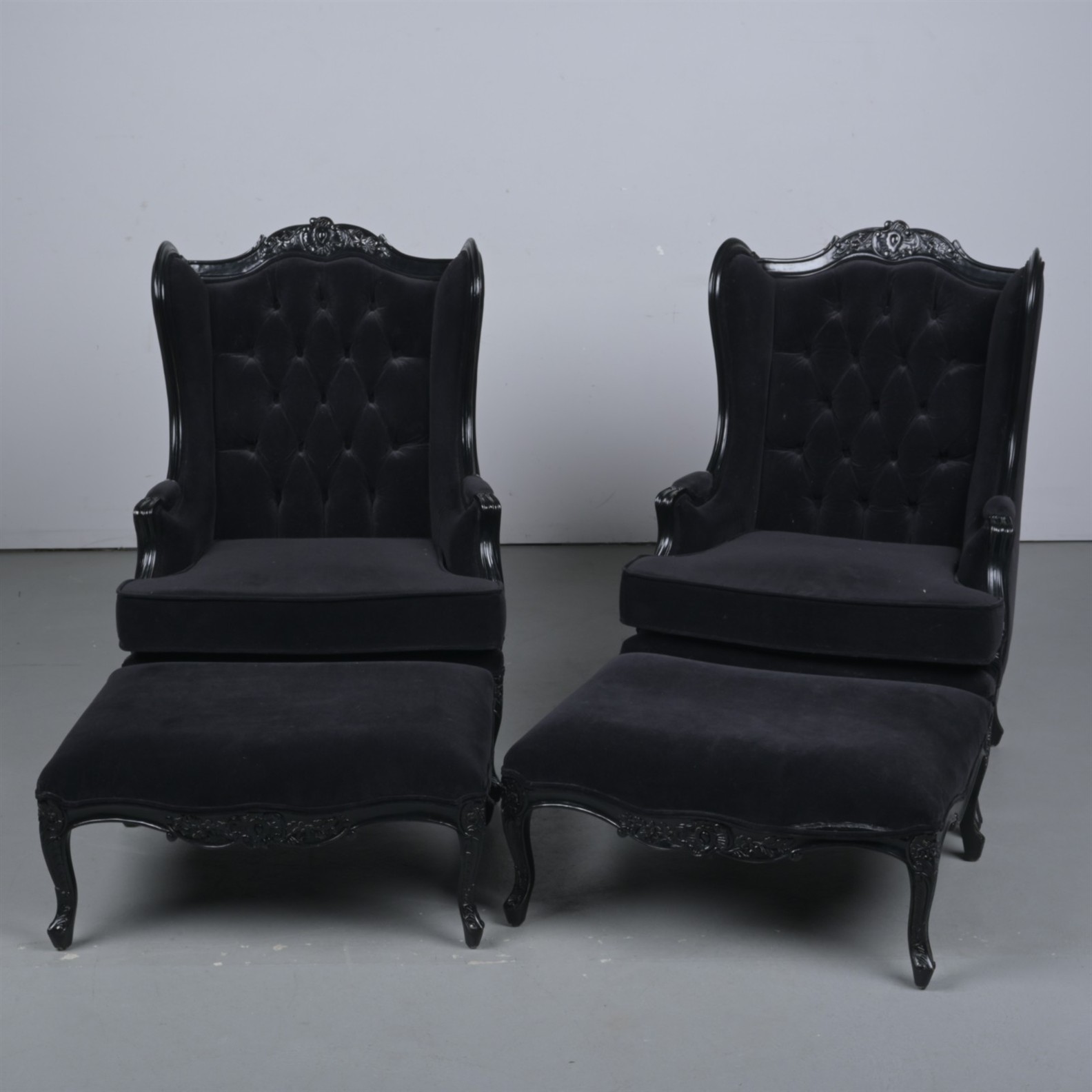 A PAIR OF BLACK VELVET UPHOLSTERED BUTTON-BACK BERGERES WITH MATCHING FOOTSTOOLS (110H X 75W X 83D CM)