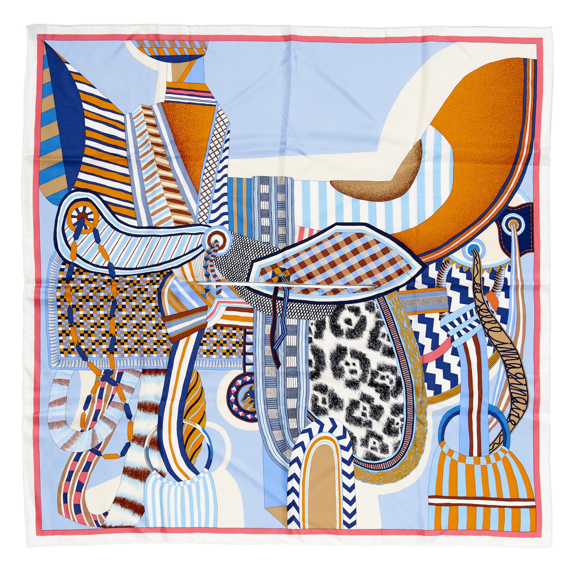 Design by Jan Bautista Van Den Heuvel featuring saddle composition styled in geometric print with animal print accents in tones of sky blue, navy, orange and rose, measures 90 cm.