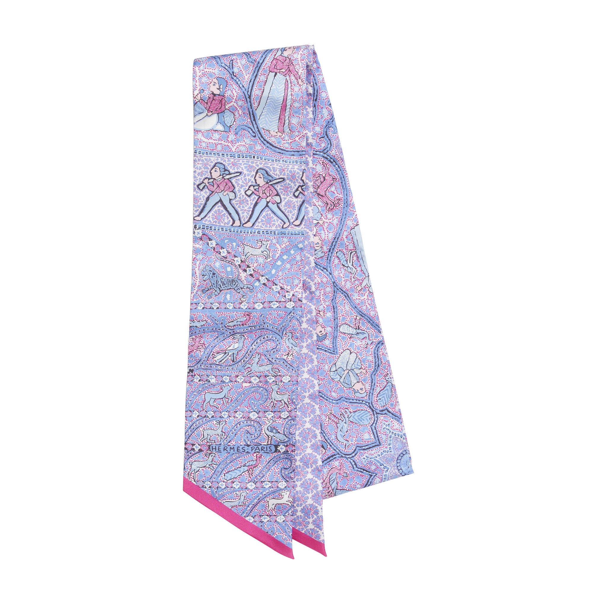 Design by Annie Faivre styled in silk featuring ornate, paisley inspired vines and folkloric detailing in tones of rose, blue and white, measures 180 x 10 cm.