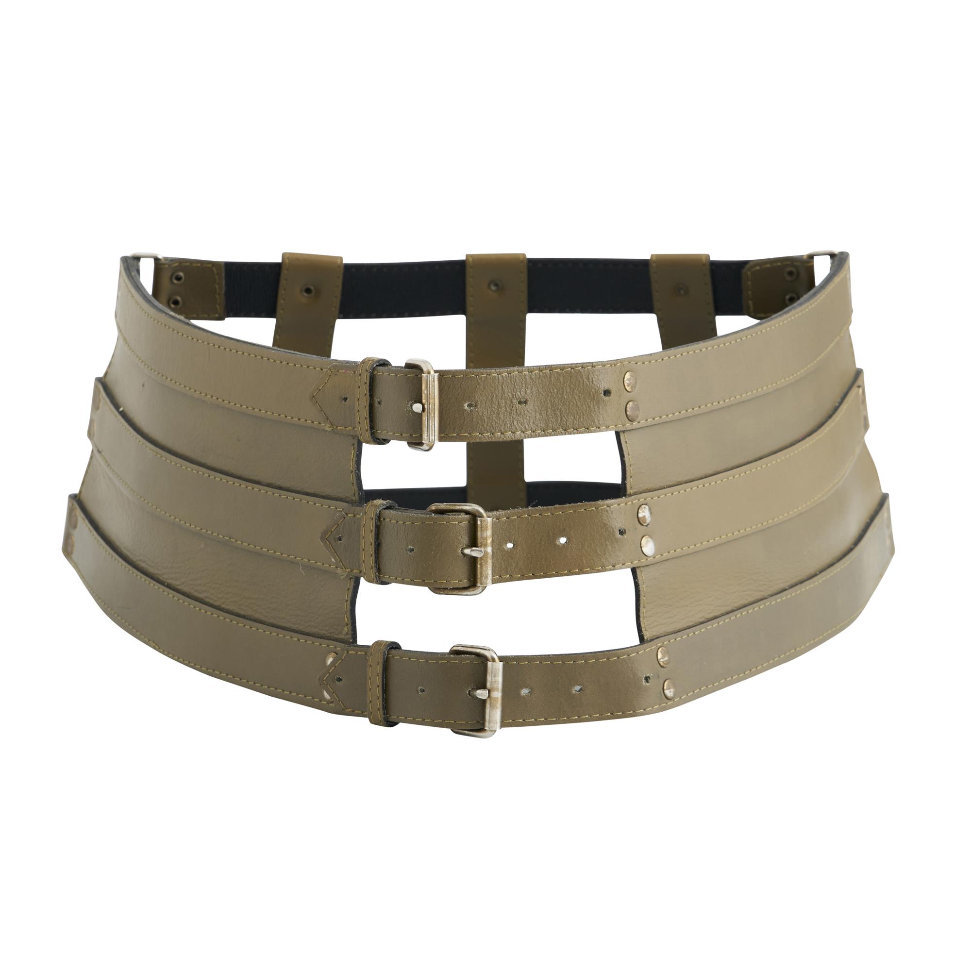 Styled in olive green leather wide wide corset leather belt, composed of multiple vertical elastacised straps with adjustable buckles and rivet detailing, marked size 90.