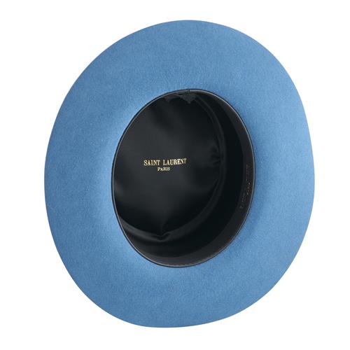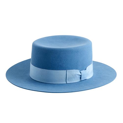 Styled in blue felt wool with tonal grosgrain trim, size unmarked.