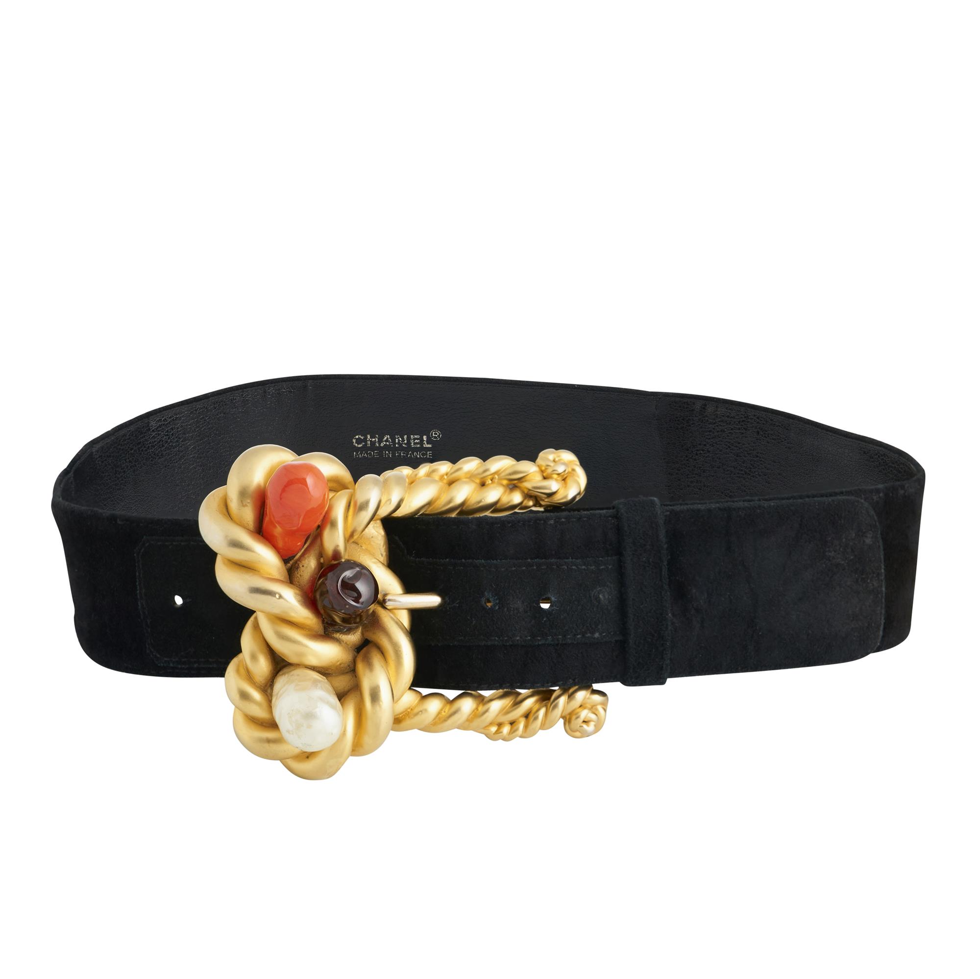 Styled in black suede with oversized gilt buckle, set with multicolour cabochons including faux pearl, amber and garnet glass, marked size 70.
