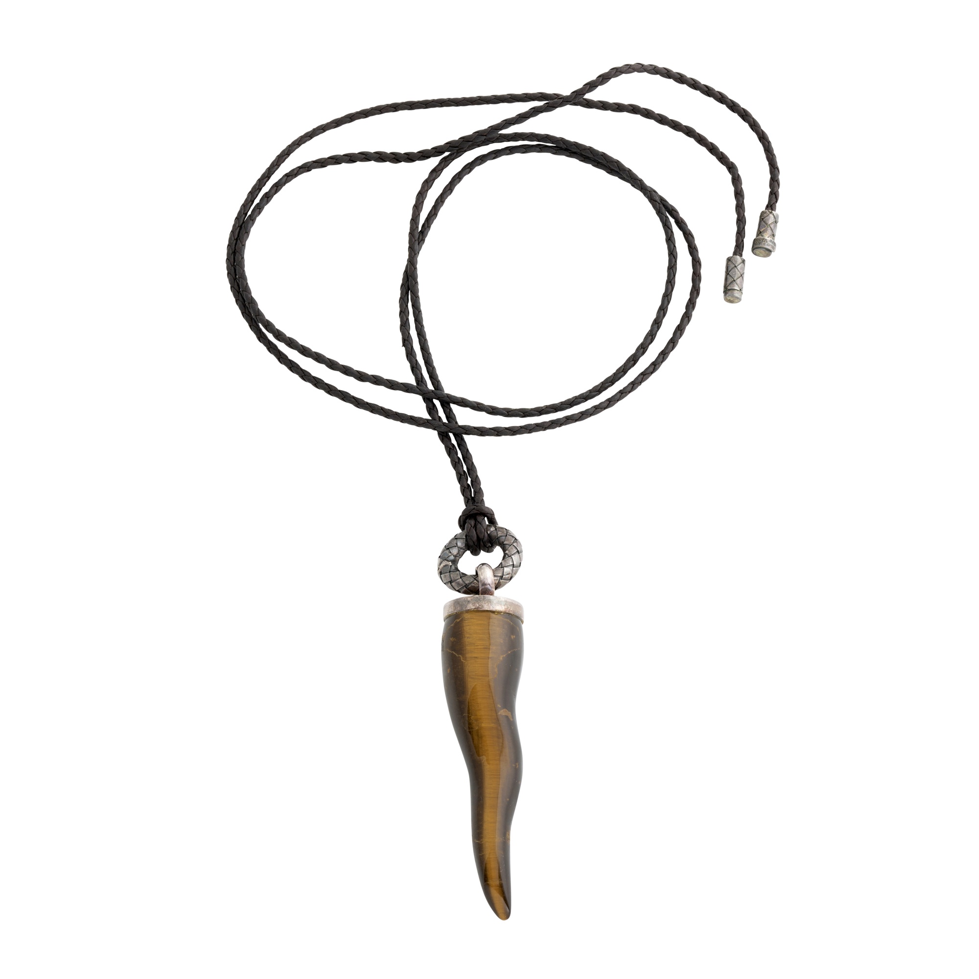 Featuring a polished tigers eye stone carved into a traditional cornicello form, finished with a sterling silver cap and intrecciato textured bale, suspended from a brown leather braided leather cord with adjustable knot fastening.