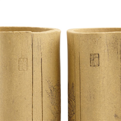 One side of the teapot is incised with a landscape scene, while the reverse bears an inscription and the signature of Lu Wenxia. The base is impressed with a seal mark reading Lu Wen Xia Zhi Yin. The cover also bears two artist seals. The two accompanying cups are similarly decorated with landscape scenes and each bears a seal marks on the side and on the base.