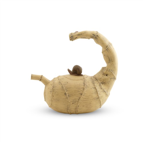 The Teapot is modelled as a section of bamboo with a smaller section forming the spout and another section forming the large curved handle, with a small ladybug on the handle, the cover with a snail-form finial; the interior of the cover with two seals 'Lu' and 'Wenxia zhi (Made by Wenxia)', and the base with a single square seal 'Lu Wenxia yin (Seal by Lu Wenxia).