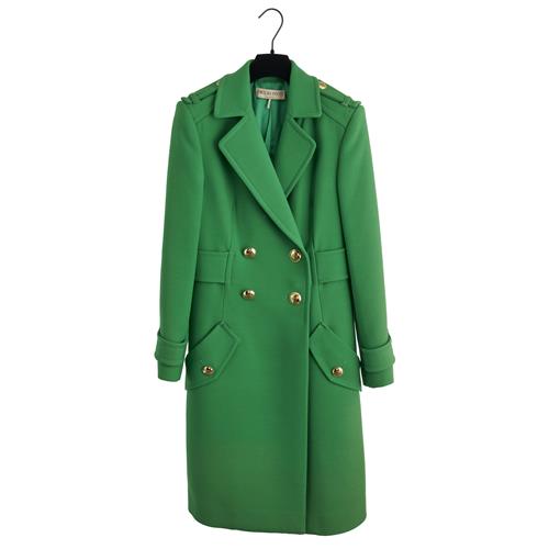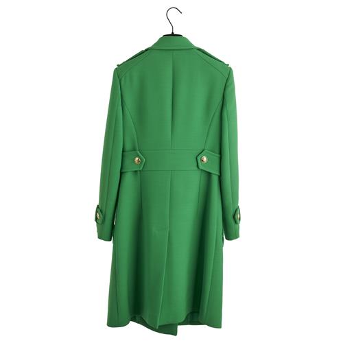 Styled in vibrant emerald green pure wool, designed with wide notched lapels, structured shoulders with epaulettes, and double-breasted gold-tone embossed button fastening, marked size IT40.