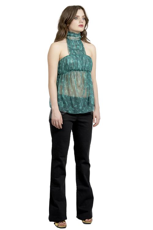 Comprising of Emilio Pucci ivory silk crepe halterneck top, with open back, plunging v-neckline and ruffle detail; together with a Saint Laurent silk chiffon halterneck top in teal, featuring a fingerprint inspired motif throughout, size unmarked for both.