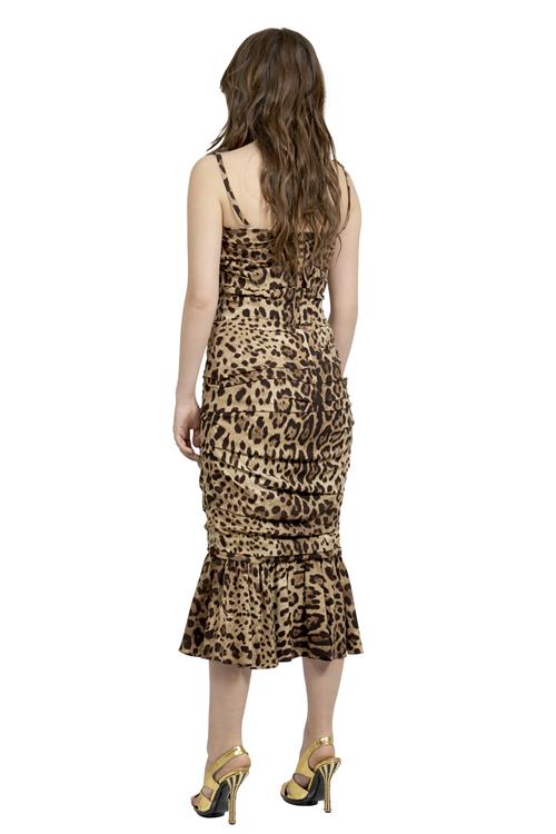 Styled in stretch silk-blend satin with fitted corset featuring all-over leopard print, designed with ruched panel construction and lightly structured bodice with narrow straps, marked size 42.